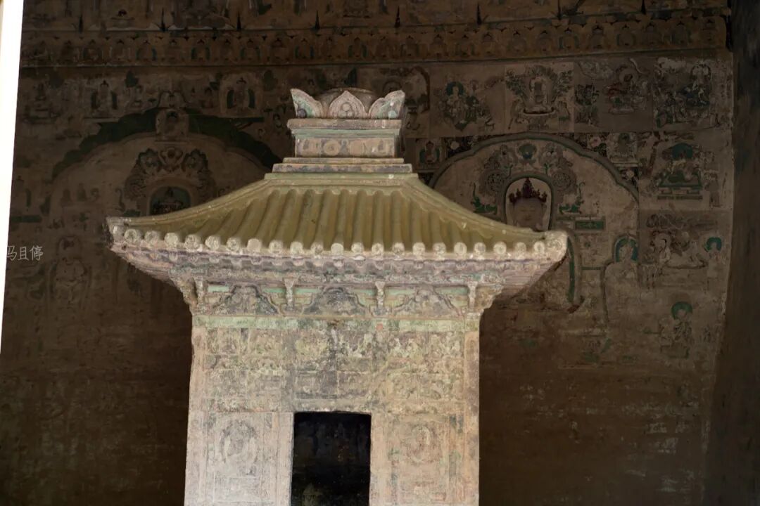 4️⃣唐代建筑资料:炳灵寺第3窟开凿于唐代,明代重新绘制过,这个窟的重点不是造像而是正中间的四坡顶方塔,整个仿木构造初唐和盛唐时期的模样,是研究唐代建筑的实例。