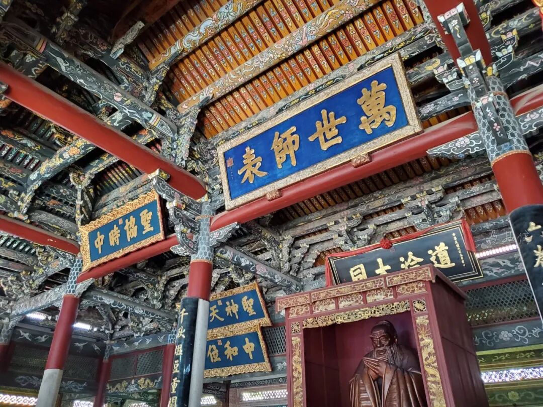 立像上方悬挂着清代康熙御书的"万世师表"牌匾,牌匾之上还可以看到古朴的木结构。