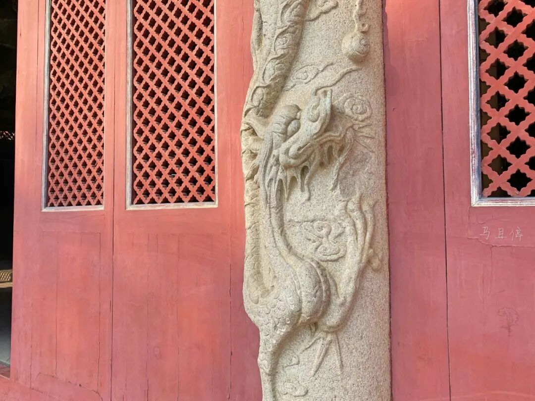 殿前有两根浮雕盘龙金柱和六根浮雕盘龙檐柱,盘龙栩栩如生仿佛飞向天空,这样的盘龙柱在中国文庙很是不常见。