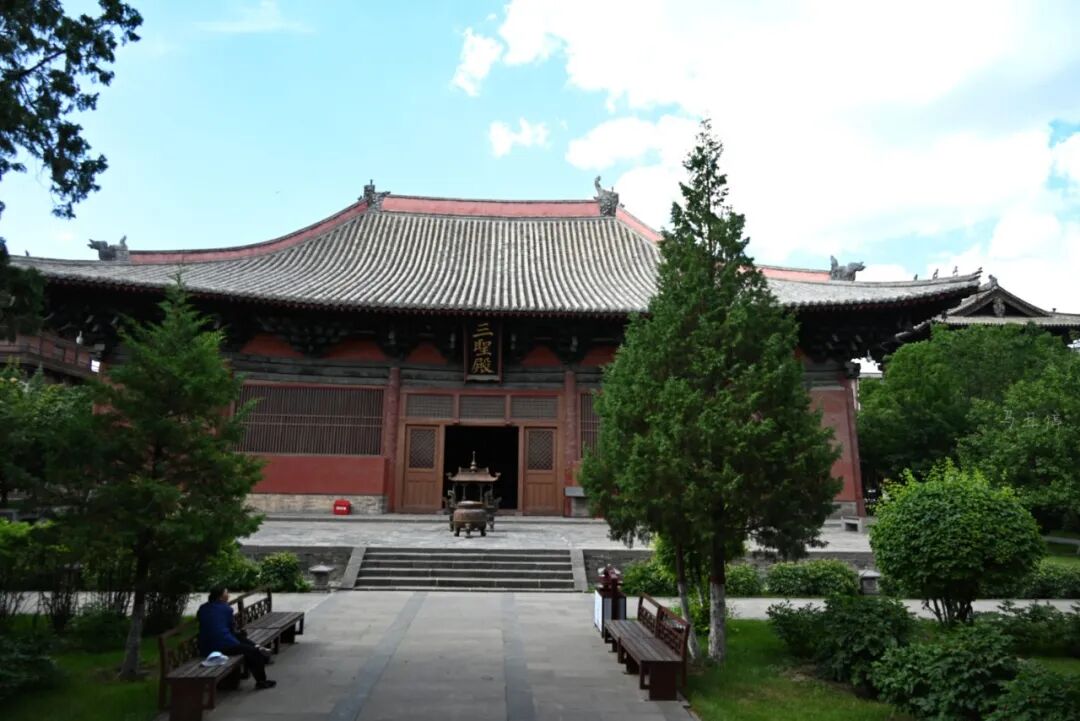 整个寺院沿中轴线坐北朝南、渐次展开。中轴线的南边为山门,中间为三圣殿,北边为大雄宝殿,层层迭高。中轴线两侧还设有普贤阁、文殊阁、廊庑配殿等。