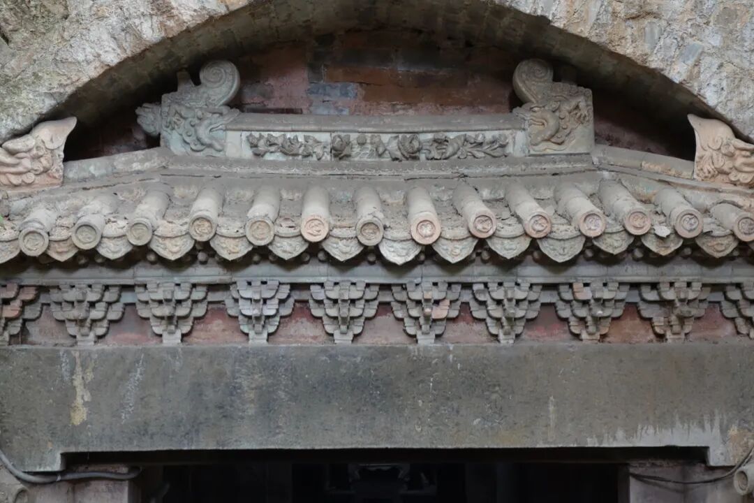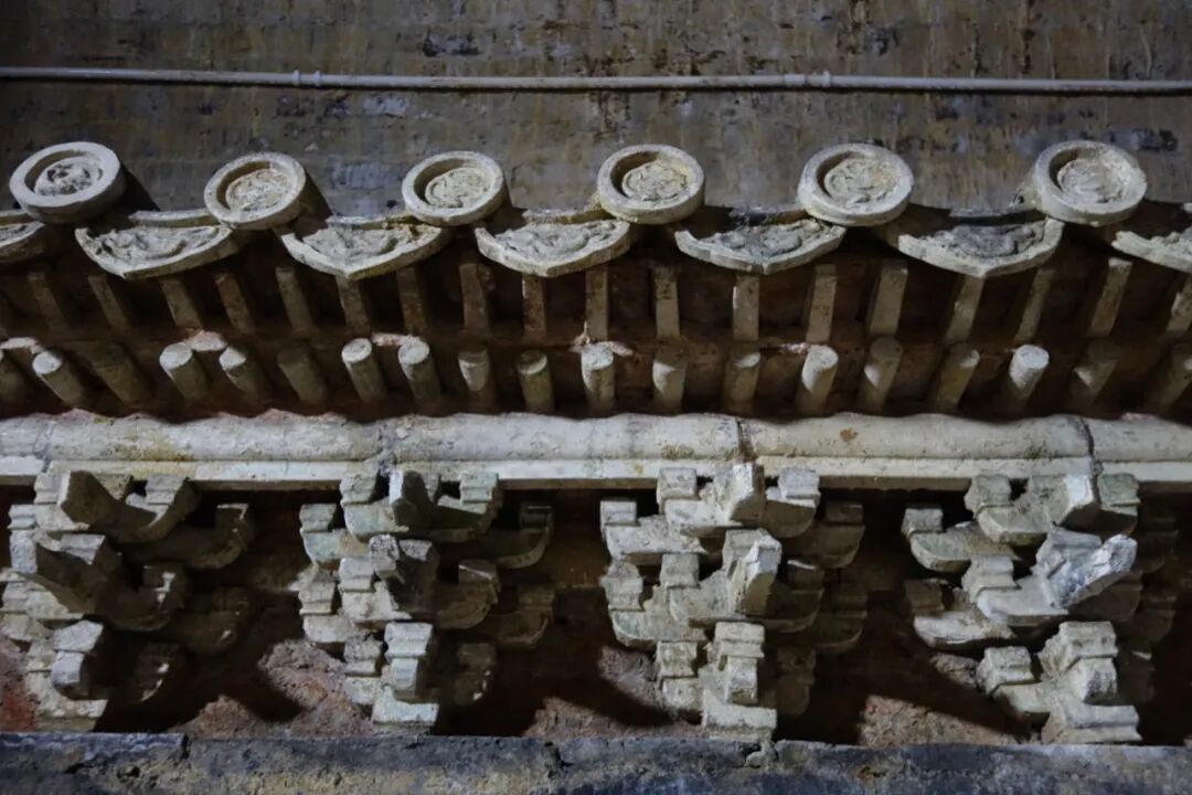 僖王陵第一个看点就在于甬道、前庭和中庭两侧的厢房,可以看得出来选用了明代建筑中特色的绿色琉璃雕刻了筒瓦硬山式大屋顶,屋顶勾头为龙纹。檐下用五铺作单抄单昂斗拱、或饰一斗三升耍头式斗拱。