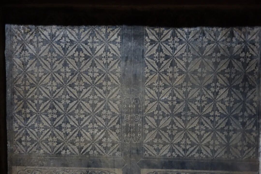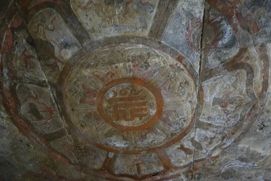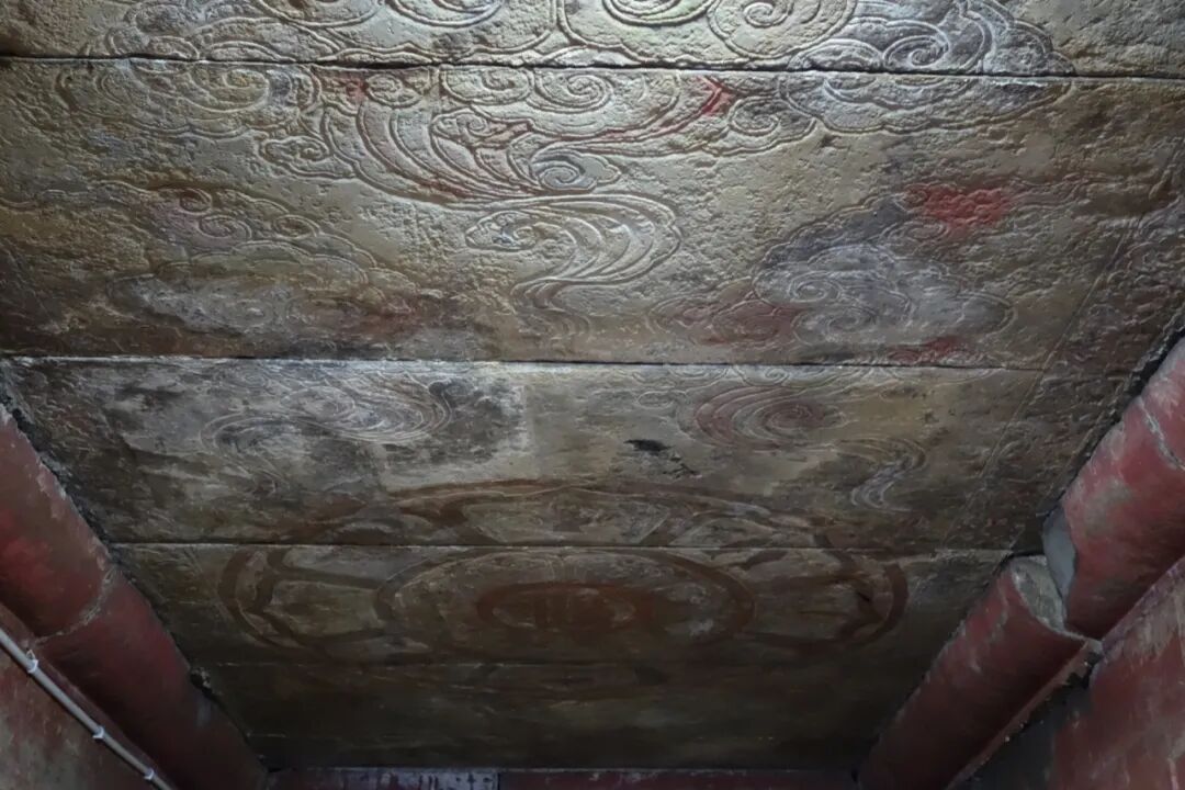 穿过了中庭后就进入了棺室区域,也就是整个僖王陵最大的看点,首先可以看到顶部雕刻了天花,天花居中,外圈为浅浮雕的八瓣莲花。每个莲花瓣的旁边分别雕刻着鱼、罐、轮、花、螺、盖、月辰、伞等佛教八宝图案。