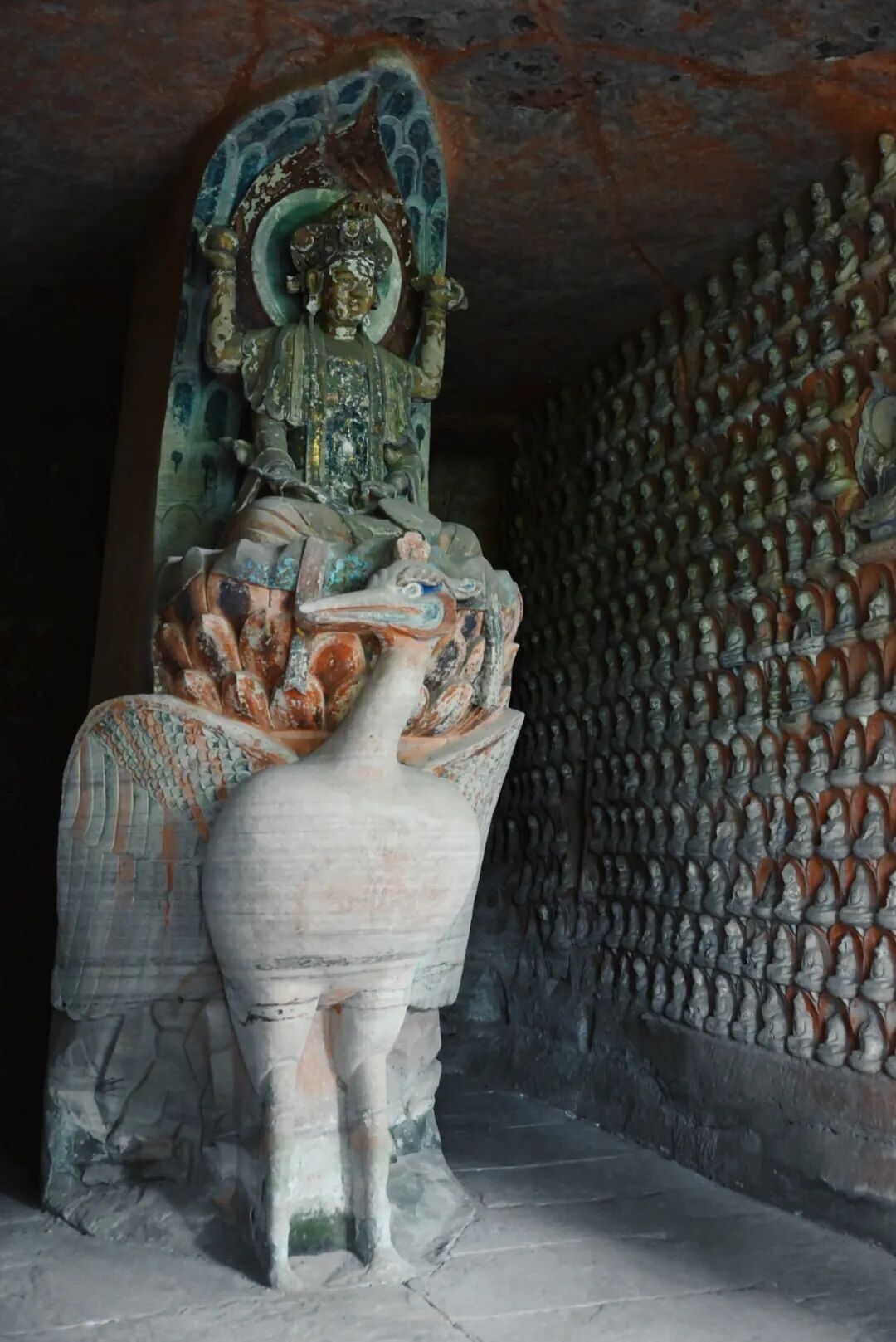 细细看的话,可以看到整个窟龛的三面崖壁上雕刻了密密麻麻的小佛像,据资料记录数量达950尊,不过最耀眼的还是当中这尊主尊佛像,这就是特色的孔雀明王,造像坐在孔雀背上,特别庄严。加上孔雀,明王身体以及背光部分都用了贴金彩绘的处理方法,整体看起来熠熠生辉。