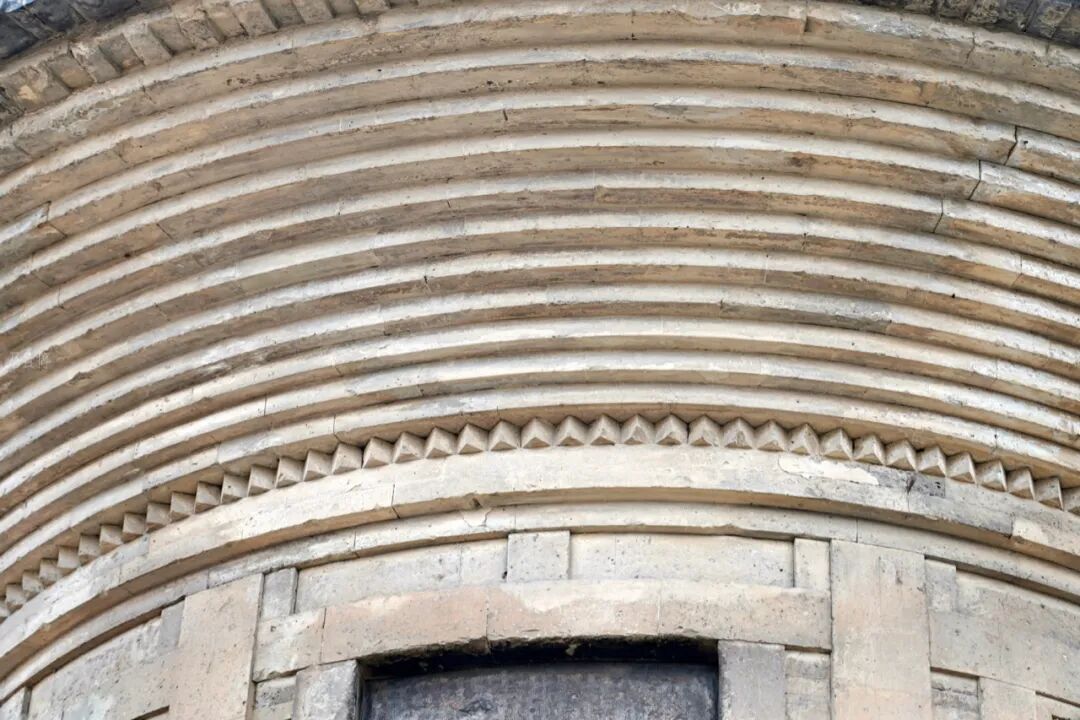 塔刹部分的底部为砖雕成菱角牙子装饰一周,接着制作成逐层递增的十二层砖叠涩塔檐,顶部为宝珠塔刹。