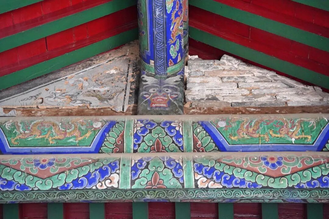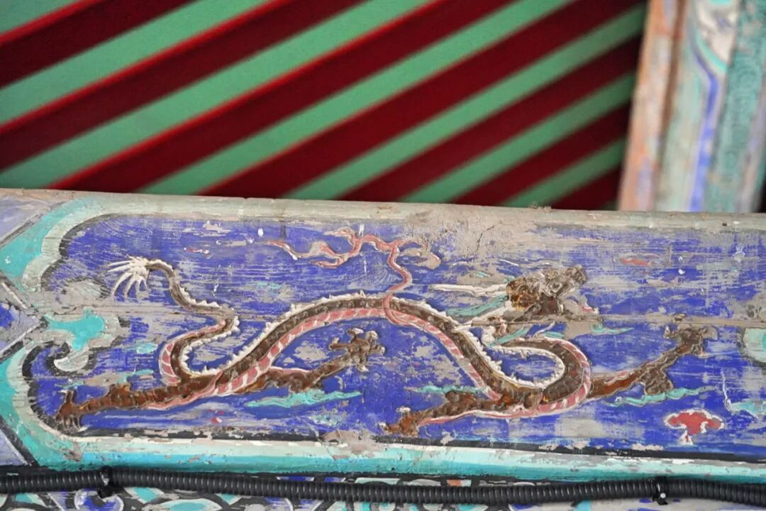 继续往后面就到了始建于明代的内香殿,看建筑应该是清代重修,因为之前看过山西的古建筑,因此这些清代的建筑看点就很少了,不过殿堂内的木檐和墙壁上还保留着不少色彩丰富的彩绘,总体看起来有些残破,但同样可以看出它的线条柔美。