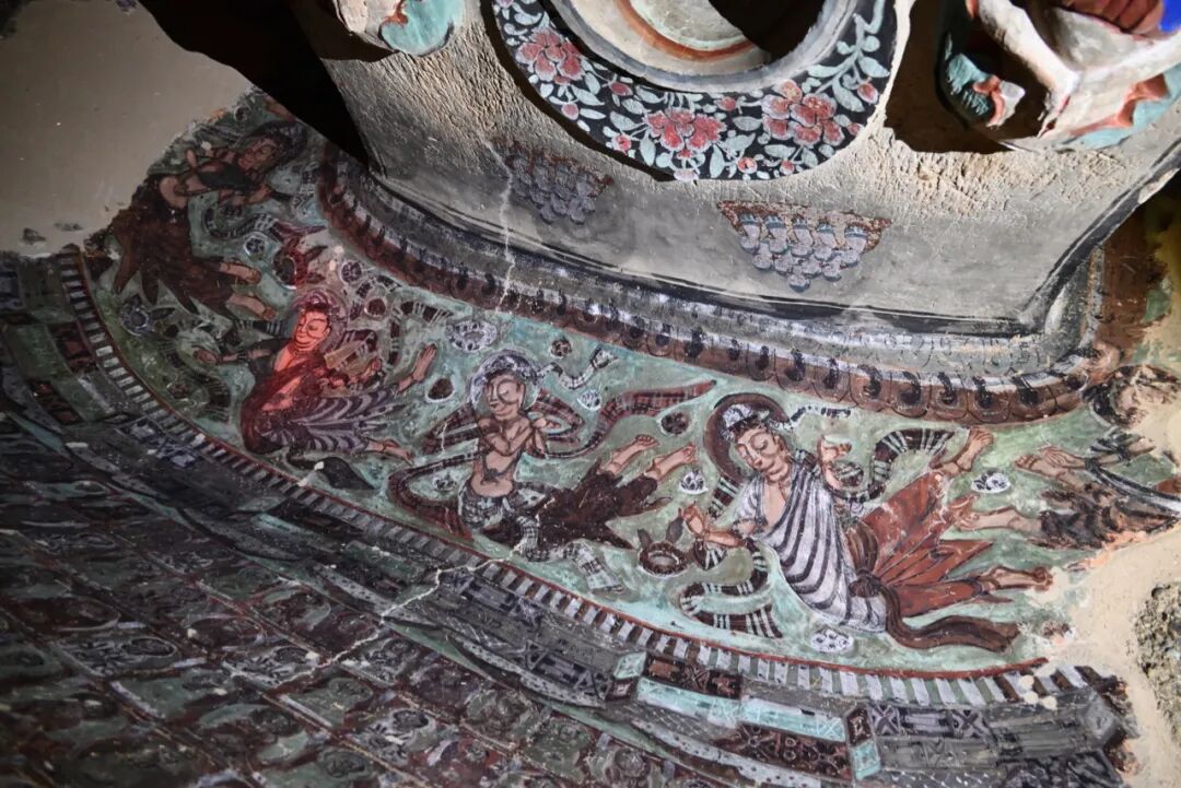 比起造像更特色的就是塔柱四周的壁画,题材多以千佛、说法图、七佛、伎乐天等主题为主,画法上和河西早期石窟采用了同样的西域晕染画法,立体感和精美度丝毫不逊色于敦煌莫高窟中的早期壁画。