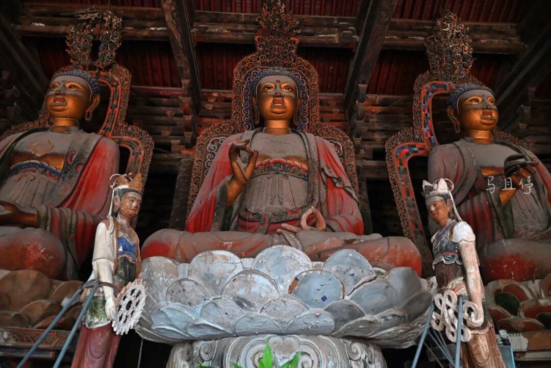每尊大佛的前面还塑有约2.5米高的胁侍菩萨,菩萨面容秀气,服装璎珞各有不同且非常精美,塑造年代几乎和大佛为同一时期。不过有些遗憾的是,这些菩萨保存完好程度不如大佛,大都残缺不全后期进行过修复,看起来有些违和感。