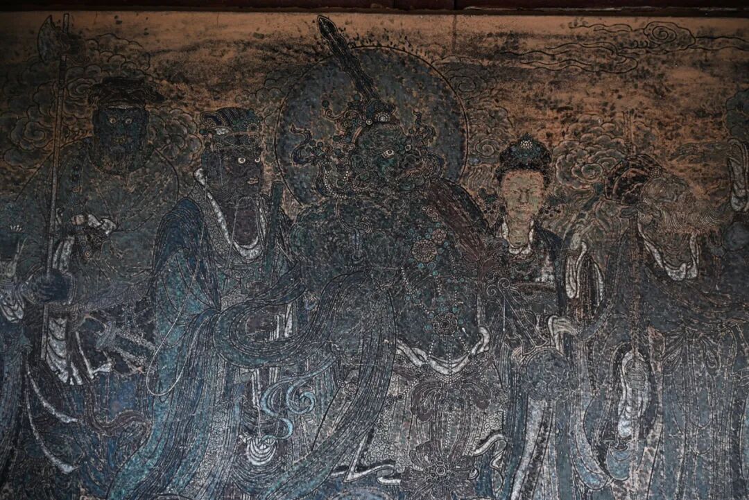 站在大殿内抬头看的话,还可以看到梁架中的彩画,雕梁画栋可谓非常绚烂。佛殿的东西两侧墙壁上可以看到元代保存至今的壁画,颜色有些暗淡,但是细节处同样可以看得出来元代壁画的线条流畅感。