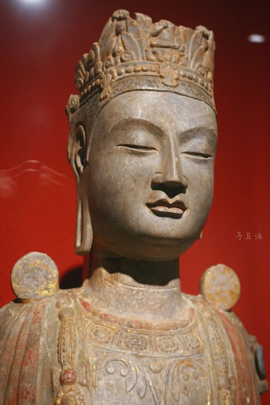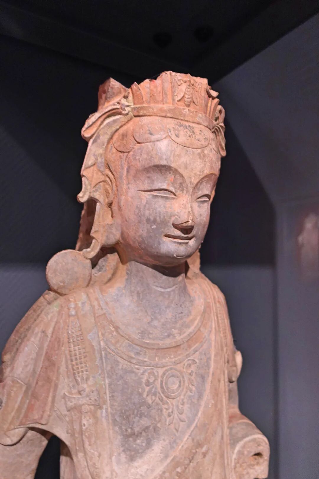 菩萨的脸型圆润,长眉弯曲,鼻子高挺,两眼微微合起呈微笑状,同样是似笑非笑的模样和刚才东魏的菩萨有着异曲同工之妙。可以看得出来整个造像中最为精妙的就是贴金彩绘,红绿黑为主色调,搭配起来丝毫没有无违和感,尤其是头部的宝冠,更是千年后依然熠熠生辉。