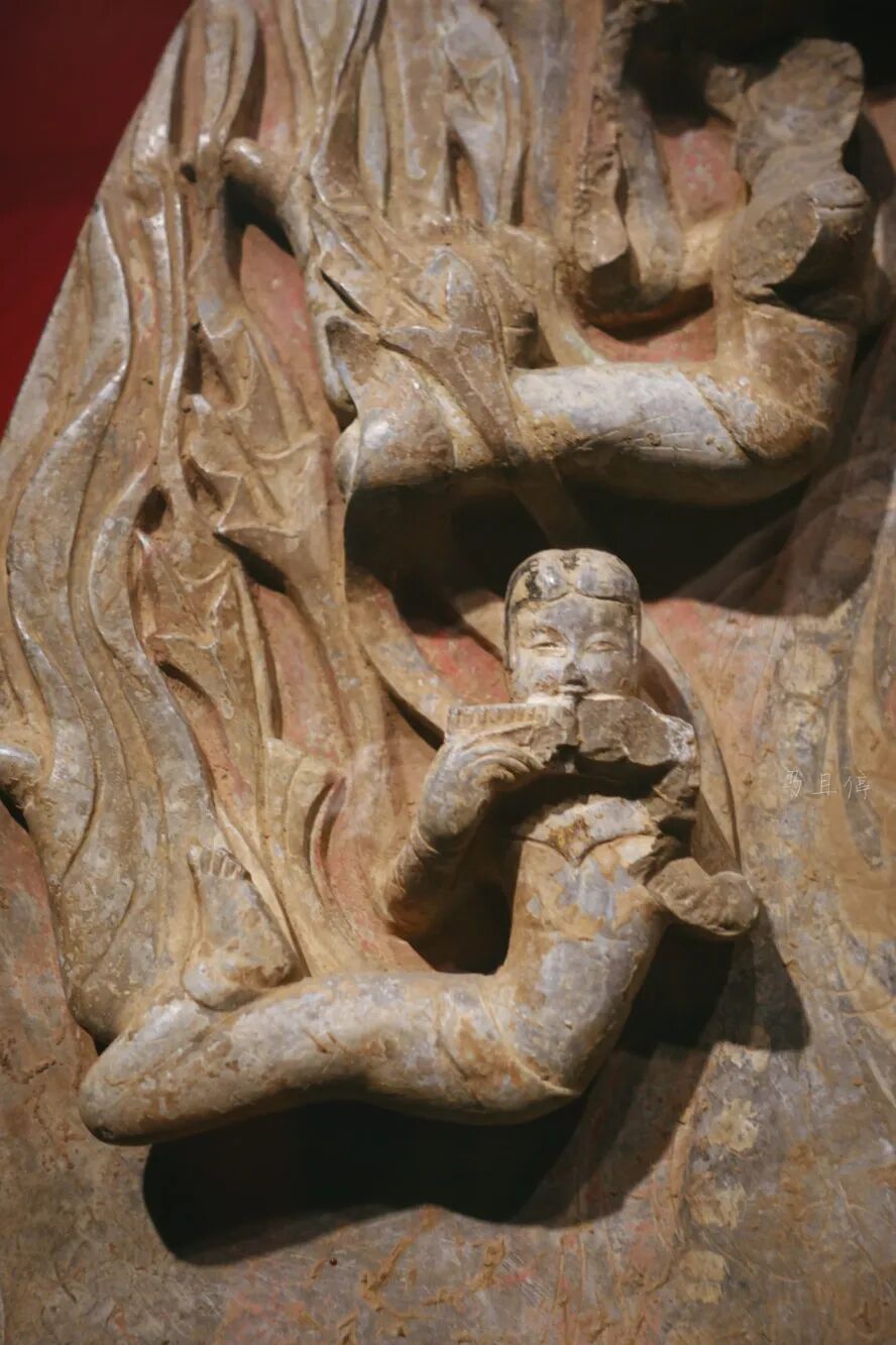上图为东魏贴金彩绘石雕左胁侍菩萨像,通过高浮雕的技法将石灰石雕刻出了三身背屏式左胁侍菩萨。丹凤眼、似笑非笑的神情、贴金处理等均为东魏造像的特色。
