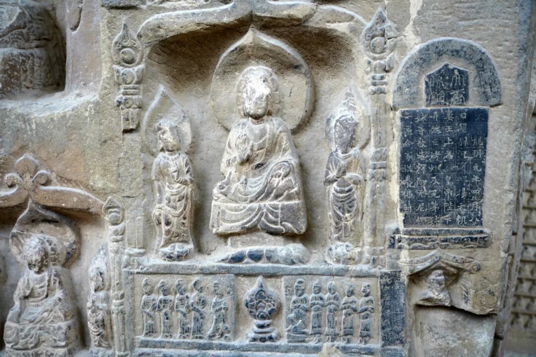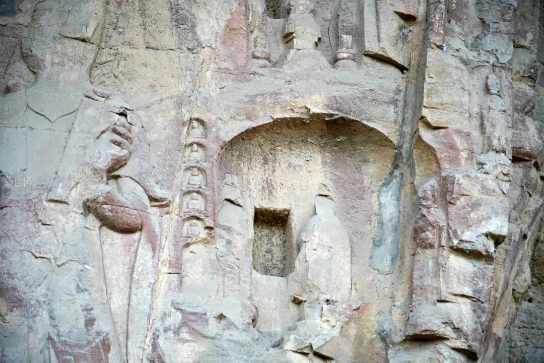 除此之外,在第3-4窟外面的崖壁上可以看到丰富的石刻群,比起第一窟外面更为完好和丰富,每一组石刻的旁边的都会刻有时间以及供养人的姓名。这些浮雕中用阴刻雕刻的开凿年代,字体秀美,欣赏价值极高。(作者:马且停,人生在于行走,旅途需要记录!)