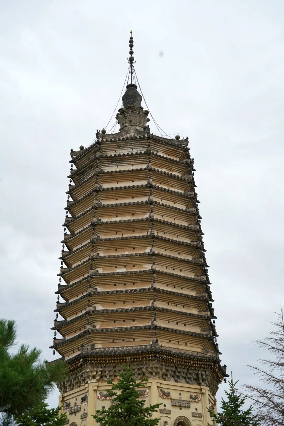 最顶端为佛塔的踏查部分,由莲座、宝瓶、刹杆和宝珠组成,最精美的地方要属宝珠部分,运用了当时皇家才能够用到的风磨铜制作而成,遗憾的是天气并不好,因此无缘看到阳光下璀璨的宝珠。