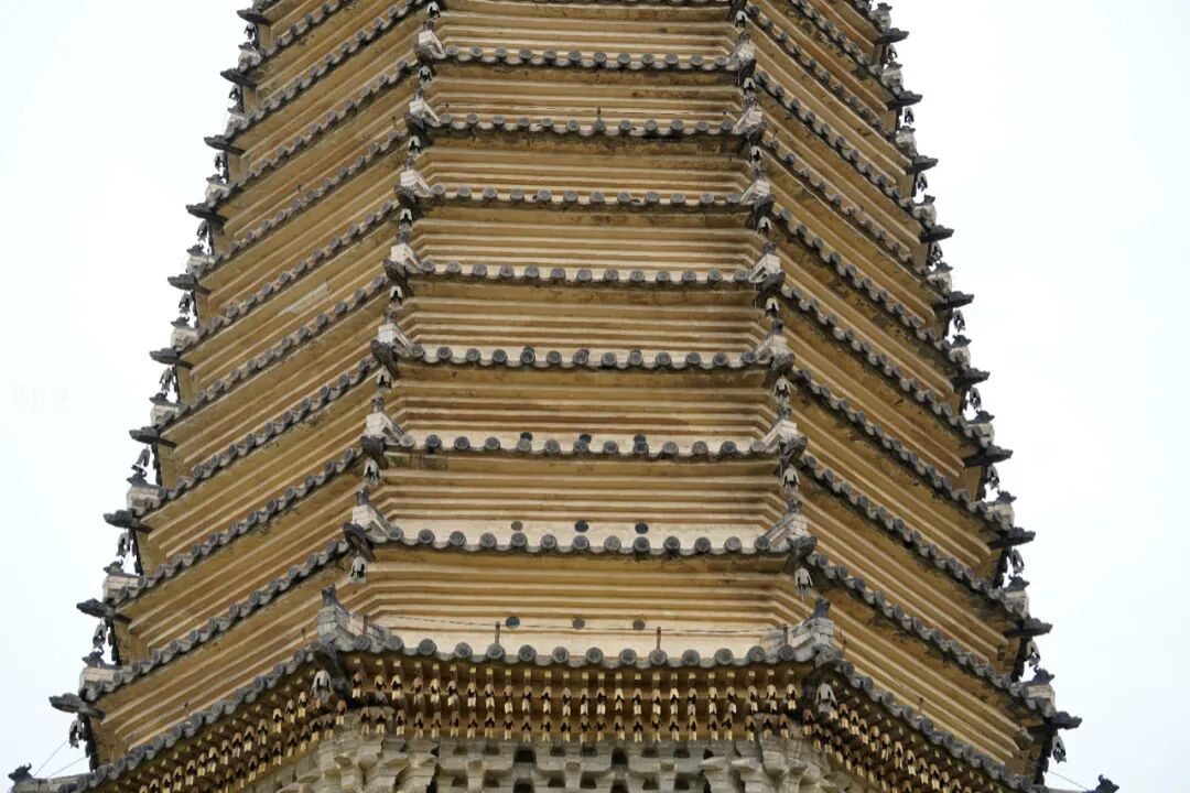 塔身下檐用砖砌出了仿木双抄五铺作斗拱,塔身每一层采用了辽金塔中依次递减的处理方式,看起来更为秀美。每层塔檐挂着风铃,微风掠过后清脆的铃声从耳中传过,仿佛遥远的辽金之音。