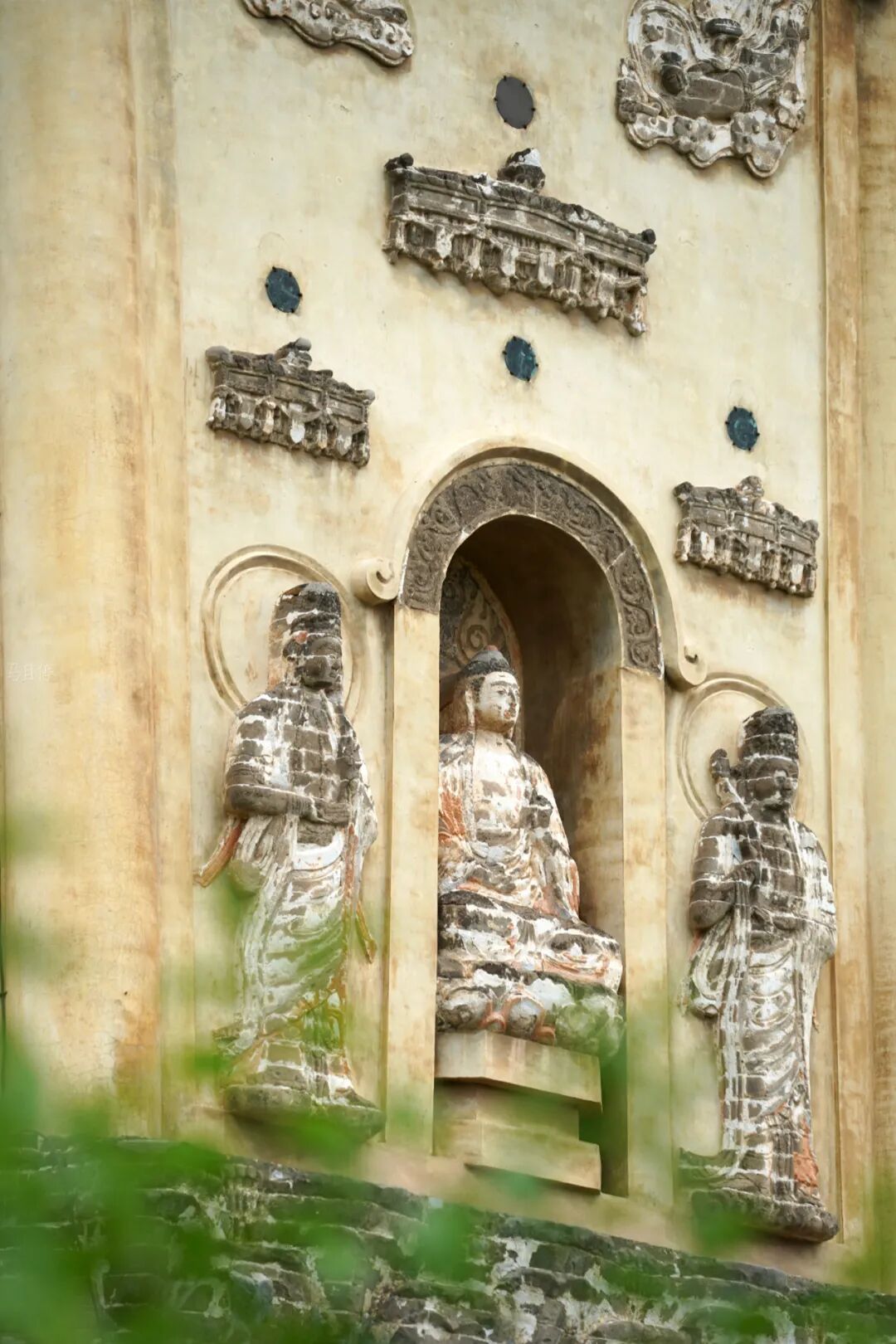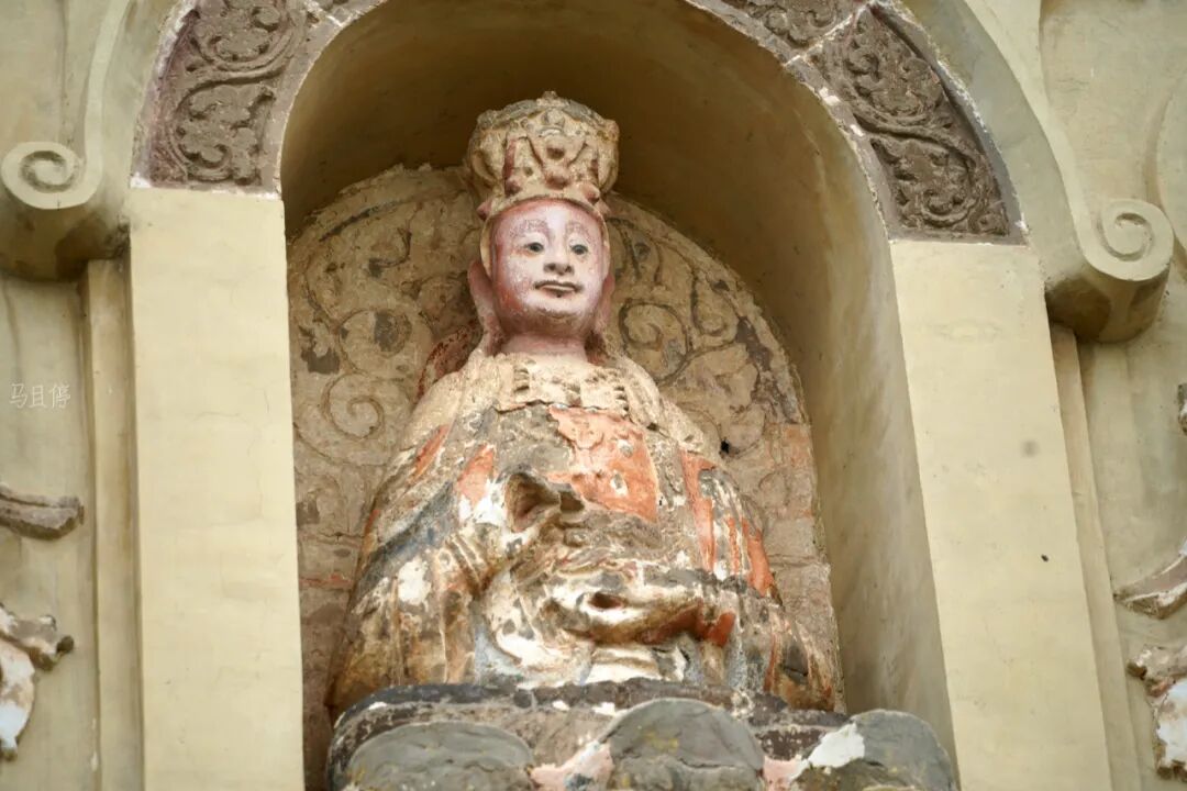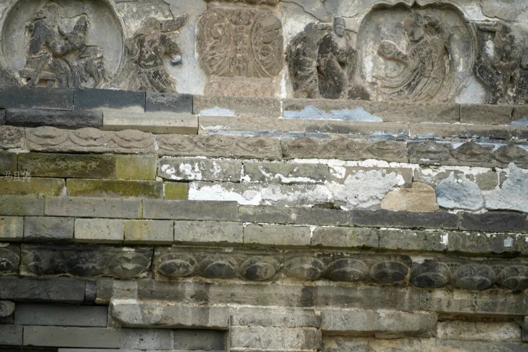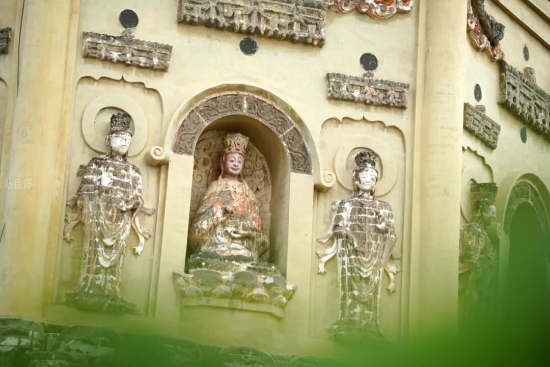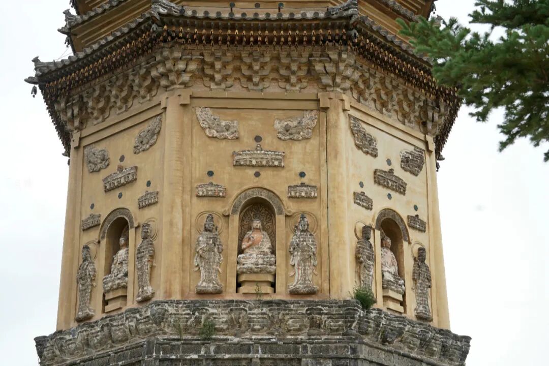 当然崇兴寺双塔最让我惊喜的地方则是佛塔塔身处的浮雕,塔身每面均开有佛龛供奉佛像,中间为主佛,佛左右两侧为胁侍菩萨,菩萨衣裙飘扬身材修长,看起来极为秀气。菩萨顶部还雕刻有华丽的宝盖以及中国早期风格的飞天乐伎。