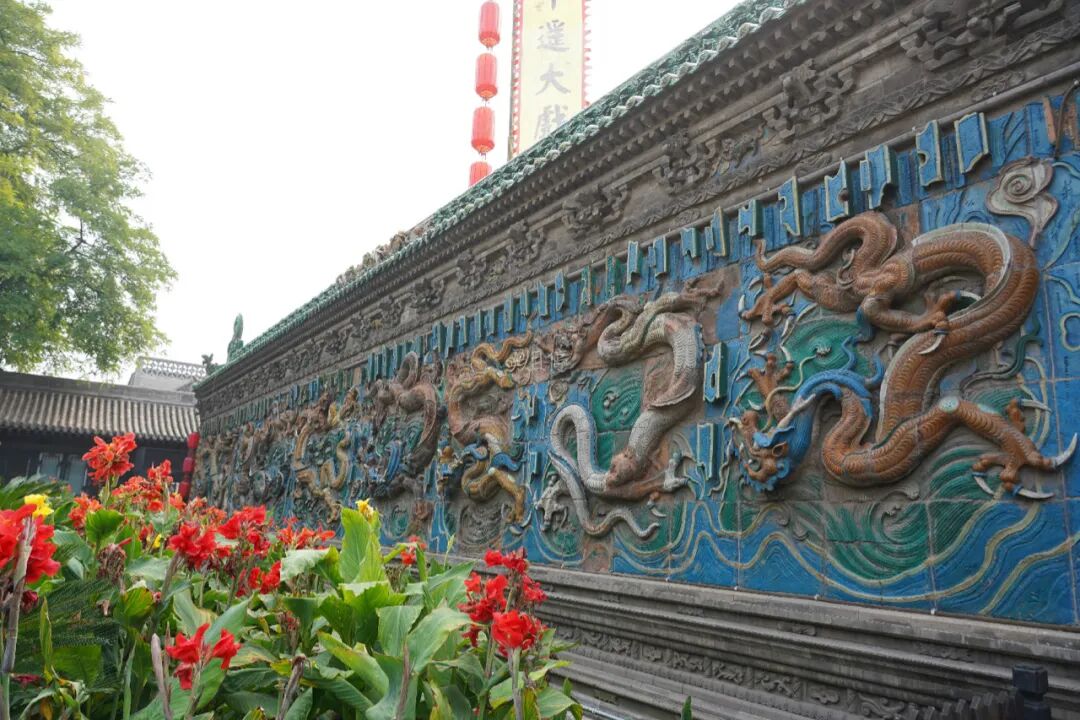 其实文庙还有一个最大的亮点,那就是地处文庙北门处的九龙壁。可以说在平遥这个小城内可以看到如此等级极高的明代九龙壁的确算是一种惊喜。高4米,宽约20米的龙壁,下面用青砖制作成须弥座,顶部灰瓦覆盖,装饰着五脊六兽。中间则是用琉璃制作成造型夸张的九条龙形状。