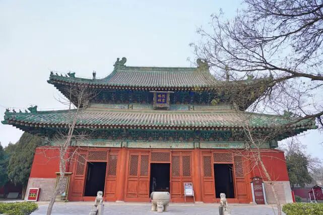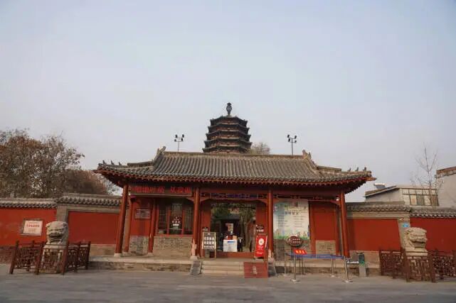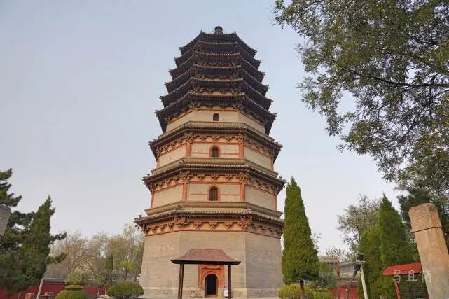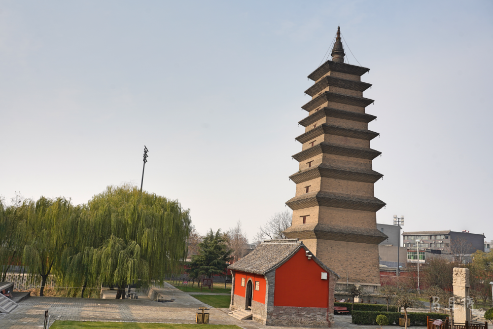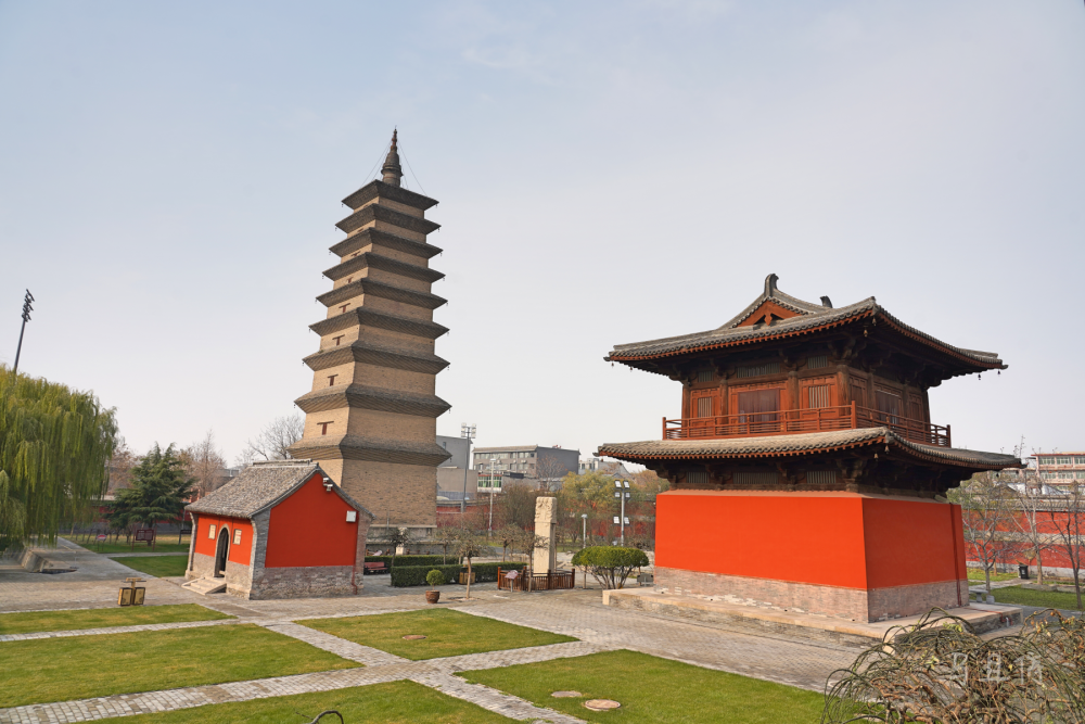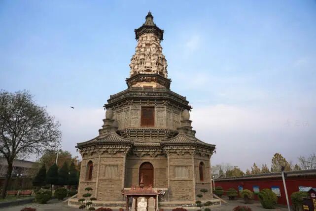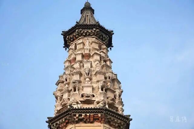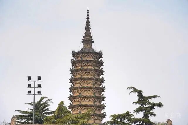 临济寺的澄灵塔同样始建于唐,现存的建筑为金代风格的砖仿木结构密檐式塔,澄灵塔最大特色就是远远望去色彩青幽,像极了一座青色的塔。