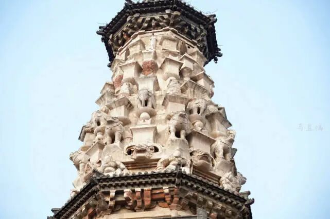 当然说到奇特,正定的广惠寺多宝塔在我看来是四塔中最为特别的一座。整个华塔高四十五米,重点看第三层以上的建筑构造,八面八角的垂线部分用龙虎豹狮象和佛像等壁塑装饰,远远望过去仿佛就像是花束一般,因此被称为花塔。