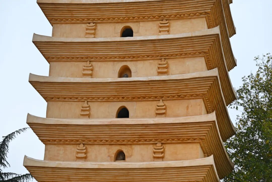 从第二层开始,塔身外部交错设置了佛龛和券洞,佛龛内还雕刻了菩萨坐像,塔身一圈均雕有仿木质的斗拱,远远望过去整座塔的塔身外观秀美,展示着唐代古塔的线条流畅之美。
