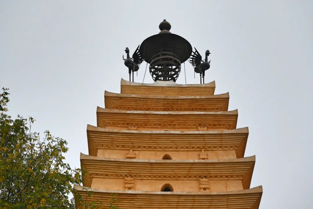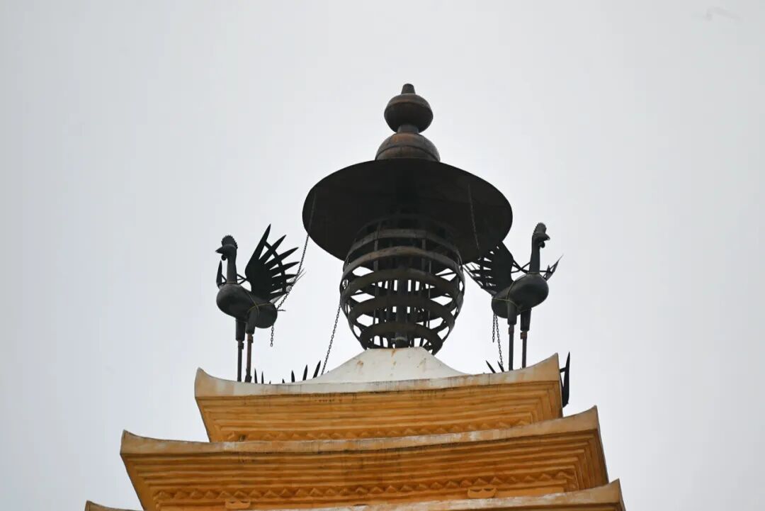 相比塔身,我个人更喜欢慧光寺塔的塔顶部分,为一个高约5米的铜质塔刹,分成了相轮、伞盖、牟尼珠三部分,尤其是四角的铜质金鸡也就是佛教中的大鹏迦奴罗。