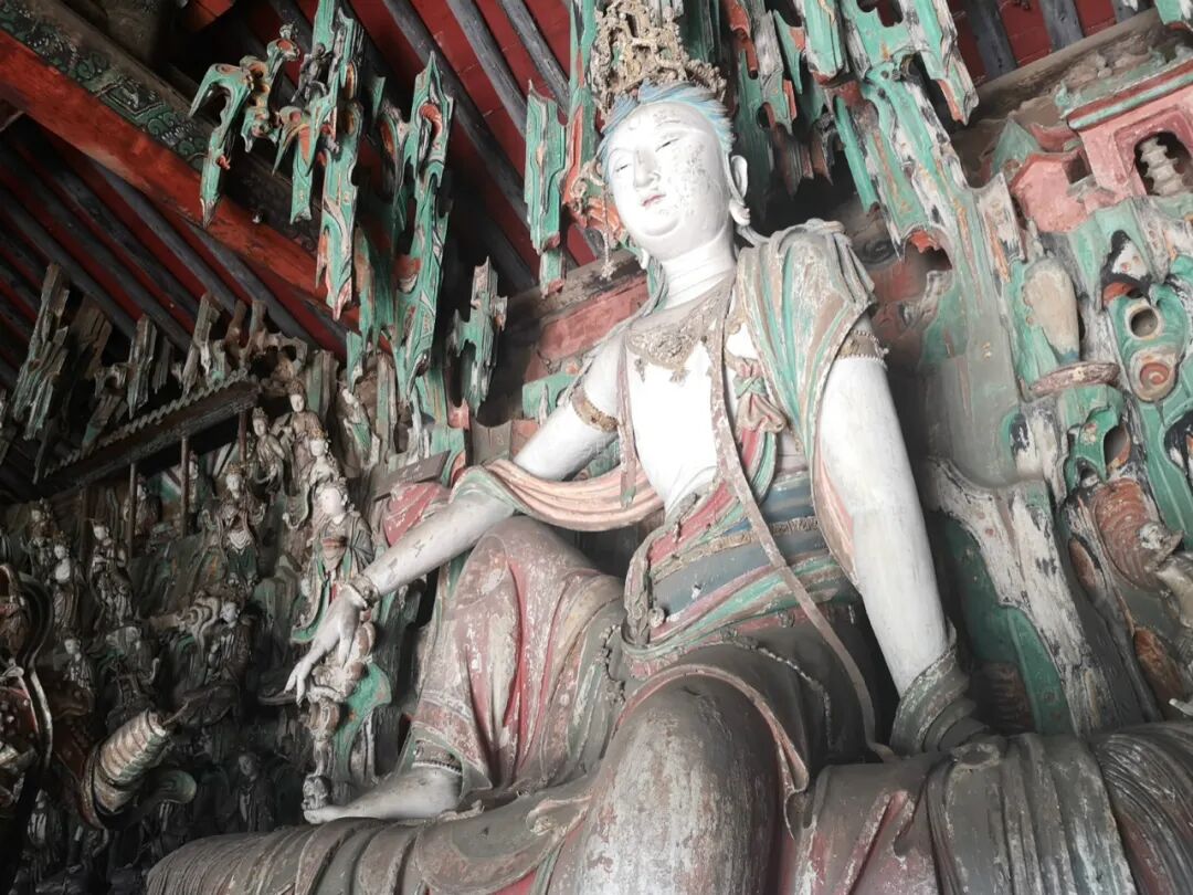 菩萨殿中的千手观音彩塑,比起四尊金刚力士而言,多了几分庄严和典雅,比例恰到好处,毫无违和感,可以说几乎是雕塑中的完美尺寸,26只手被塑造得富有弹性,有的手持法器;有的手心有眼……四周分设5-6层悬塑着400多尊菩萨,虽然彩塑形态各异,但却同样共享着彩云,算是中国古代悬臂雕塑艺术的精华之作。