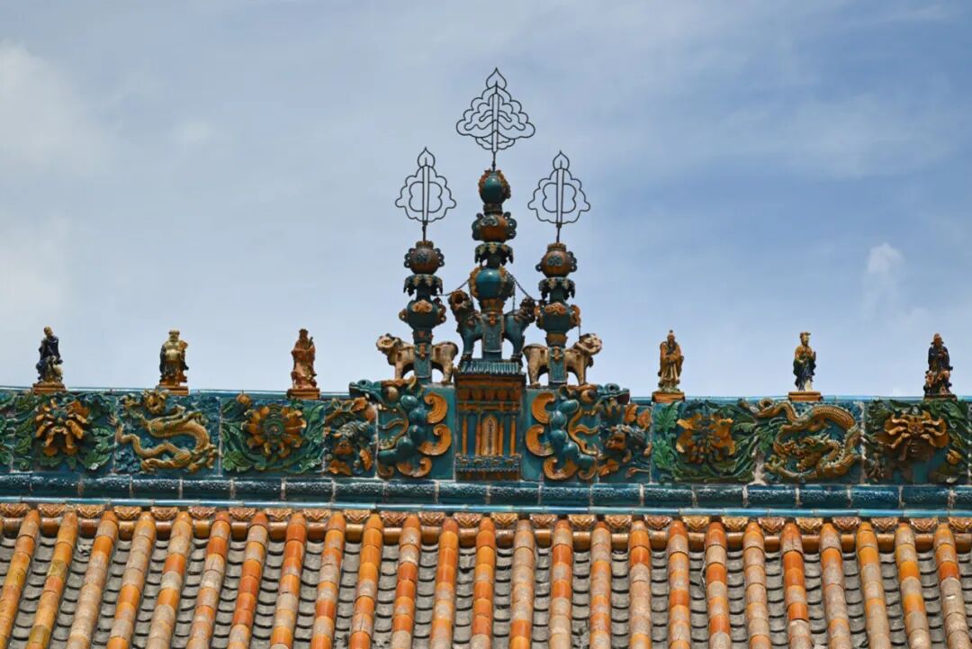仔细看的话,还可以看到这些琉璃构件题材非常丰富,像狮子驮宝瓶,八仙过海,天地十界十方万灵真宰题字等都可以一一看到,这些异域风情的构建和山门的景教琉璃构件相呼应,让永安寺看起来多了几分多元气息。