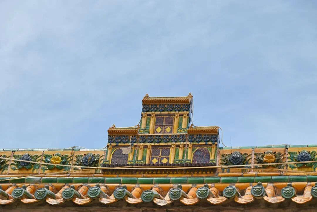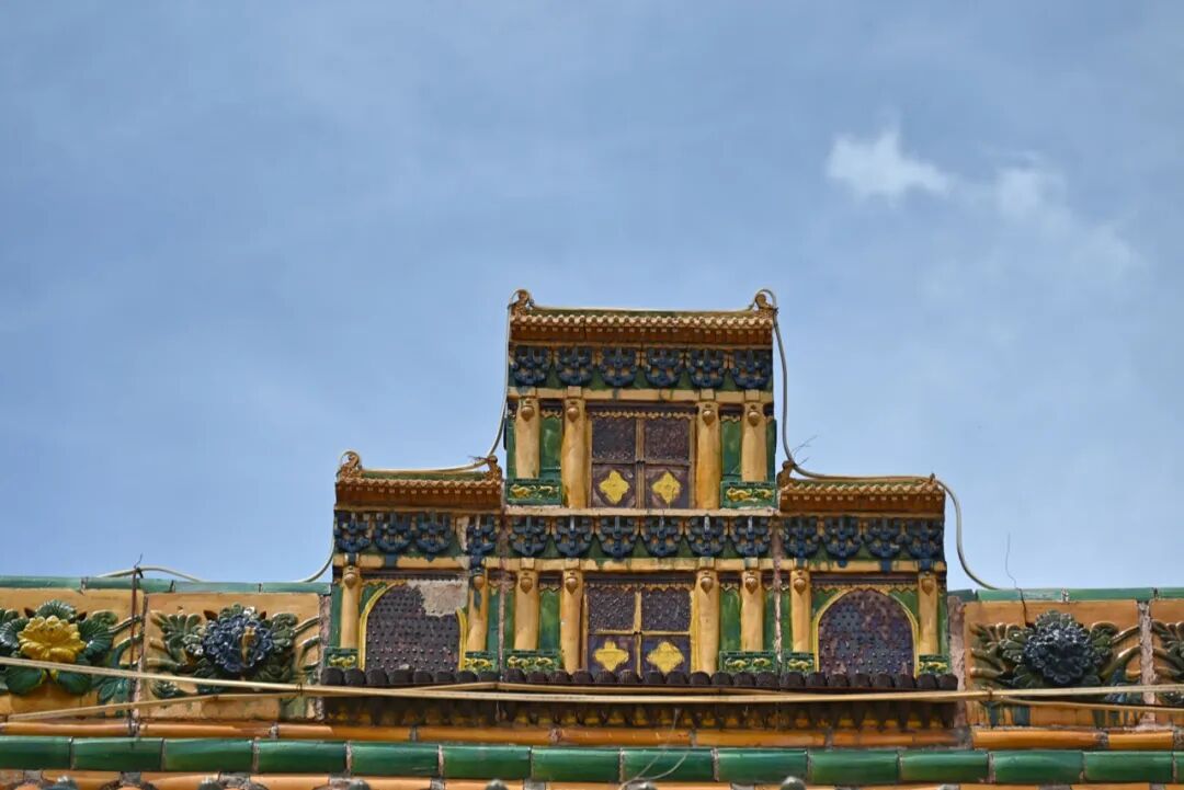 当然永安寺山门最大看点还在于起顶部的构建,整体用皇家御用的黄色黄色琉璃覆盖,东东西两边装饰有双龙戏珠的琉璃构件,中间的殿刹最为抢眼,是中国境内罕见的景教风格的琉璃装饰品。