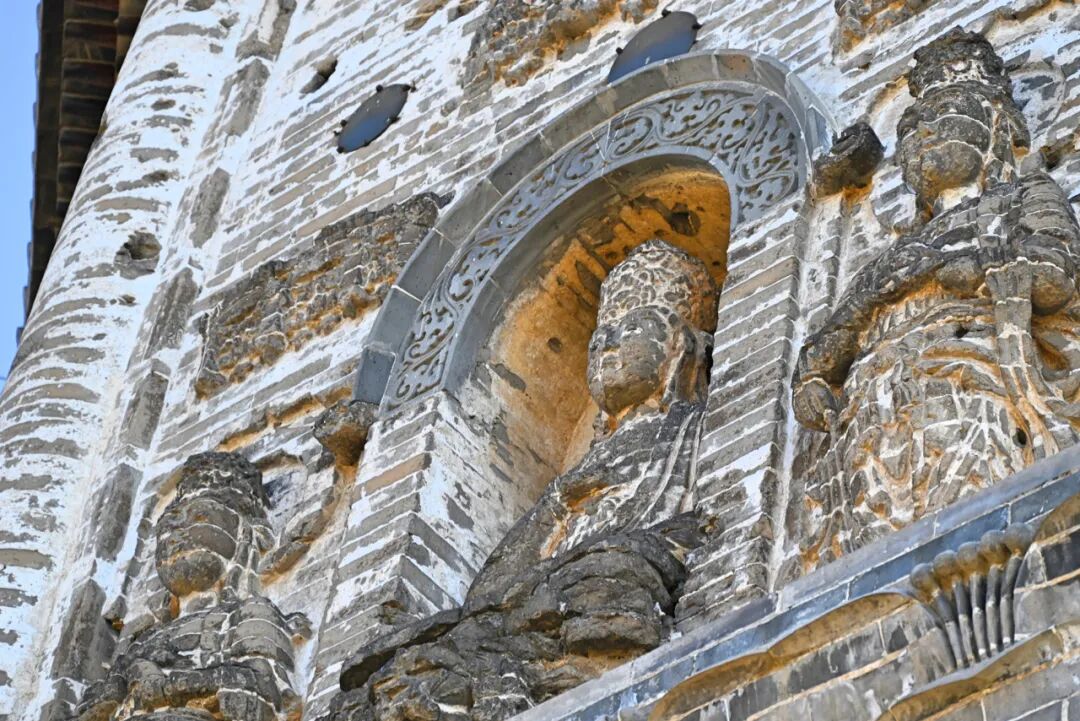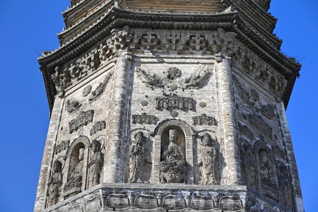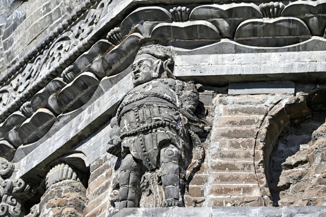 当然欣赏广胜寺塔一定要关注其塔身的浮雕,在须弥座处可以看到灰砖伎乐天浮雕,他们舞姿曼妙、手执乐器吹笛吹箫;须弥座转角处可以看到威武的力士,手执兵刃,作仰莲式承托塔身。