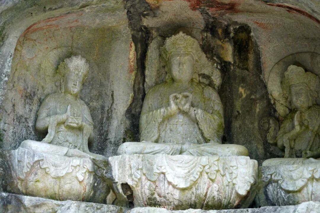 首先在你刚到飞来峰的时候,会看到三尊飞来峰最古老的佛像,那就是开凿于五代时期的西方三圣佛的造像,虽然作为景区内年代最久远的造像,但是保存得非常完好,细节的地方也都可以看得很清楚。