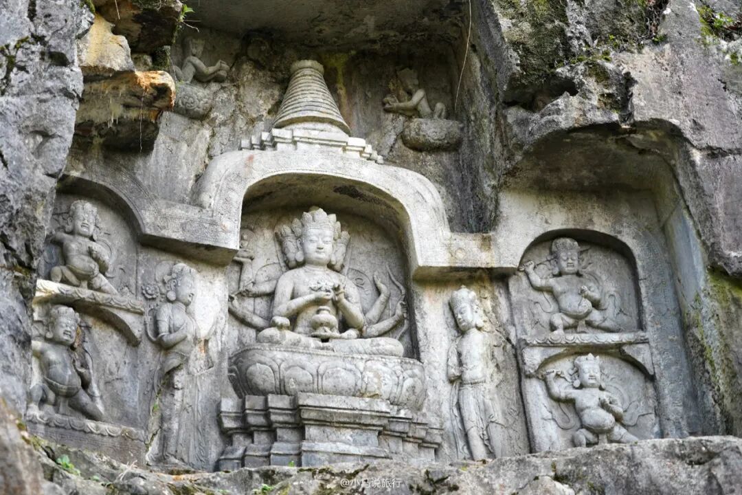在冷泉溪上面,还藏着不少元代梵式的造像,可以说在江南地区能够看到如此异域气息的造像石窟,可谓是让小马惊喜了。在众多元代造像中,小马最喜欢的就是尊胜佛母这一组,不论是佛母,菩萨还是佛塔,雕工都很精美,并且保存都很完好,不愧是飞来峰中元代造像中的精髓。