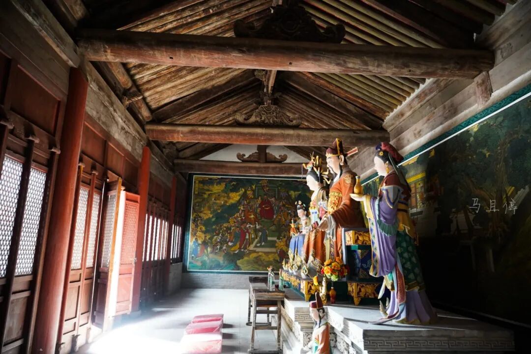 从新修的山门进入之后,第一眼看到的建筑就是元代建造的享亭, 为一座面阔面宽五间,进深四檐的单檐歇山顶建筑。殿堂内并没有金柱,但可以看得出来典型的元代大木构建筑,又粗又大的圆木阑额,展现了元代蒙古族的粗派豪放风格。