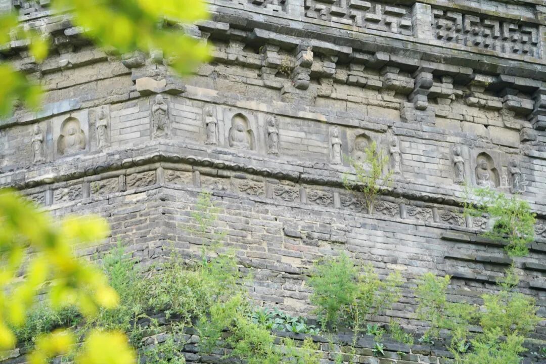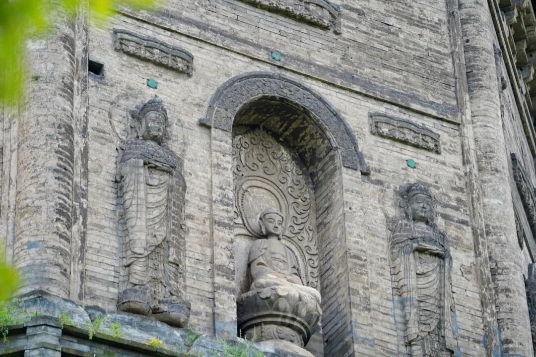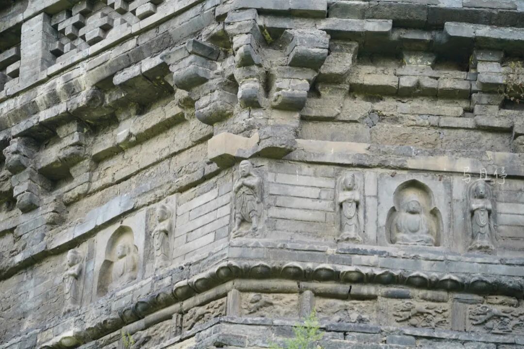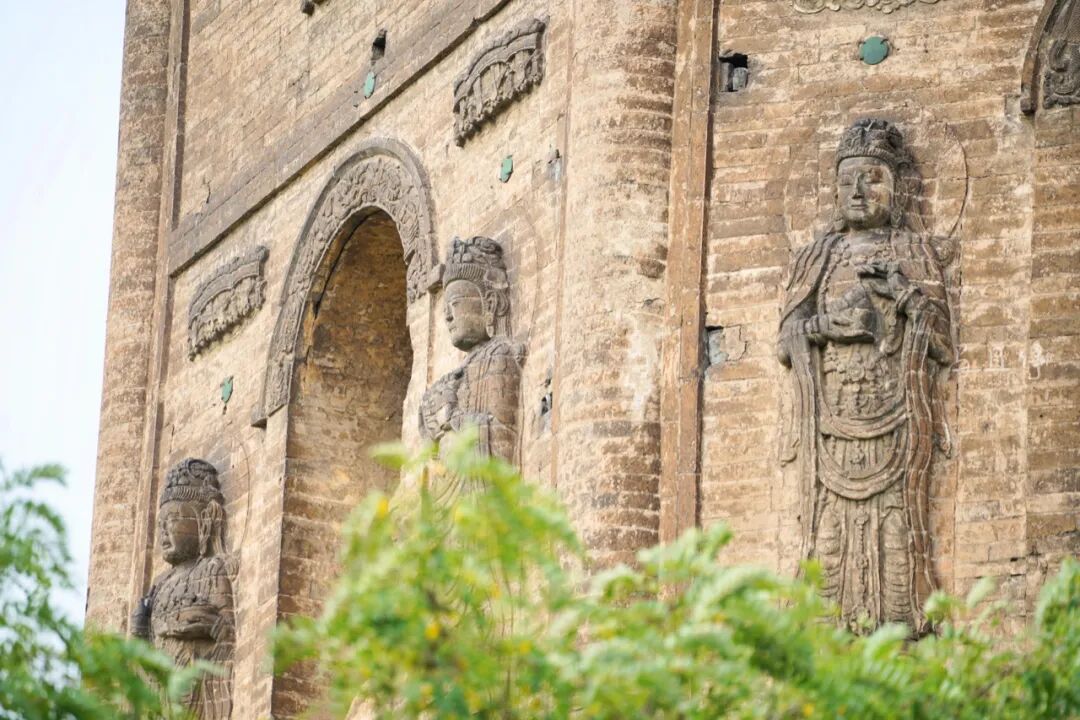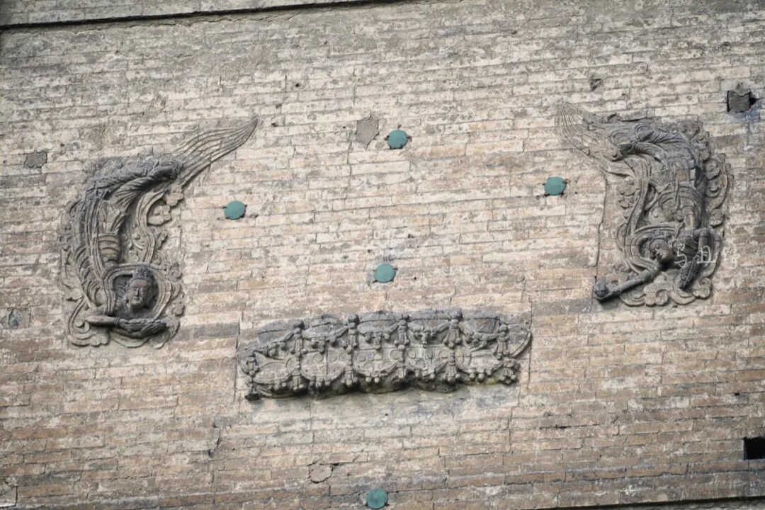 菩萨之上还设有大宝盖,左右两侧分别装饰有有飞天浮雕,可以看得出来菩萨、飞天都是提前预制的构建,然后嵌入塔身之上。