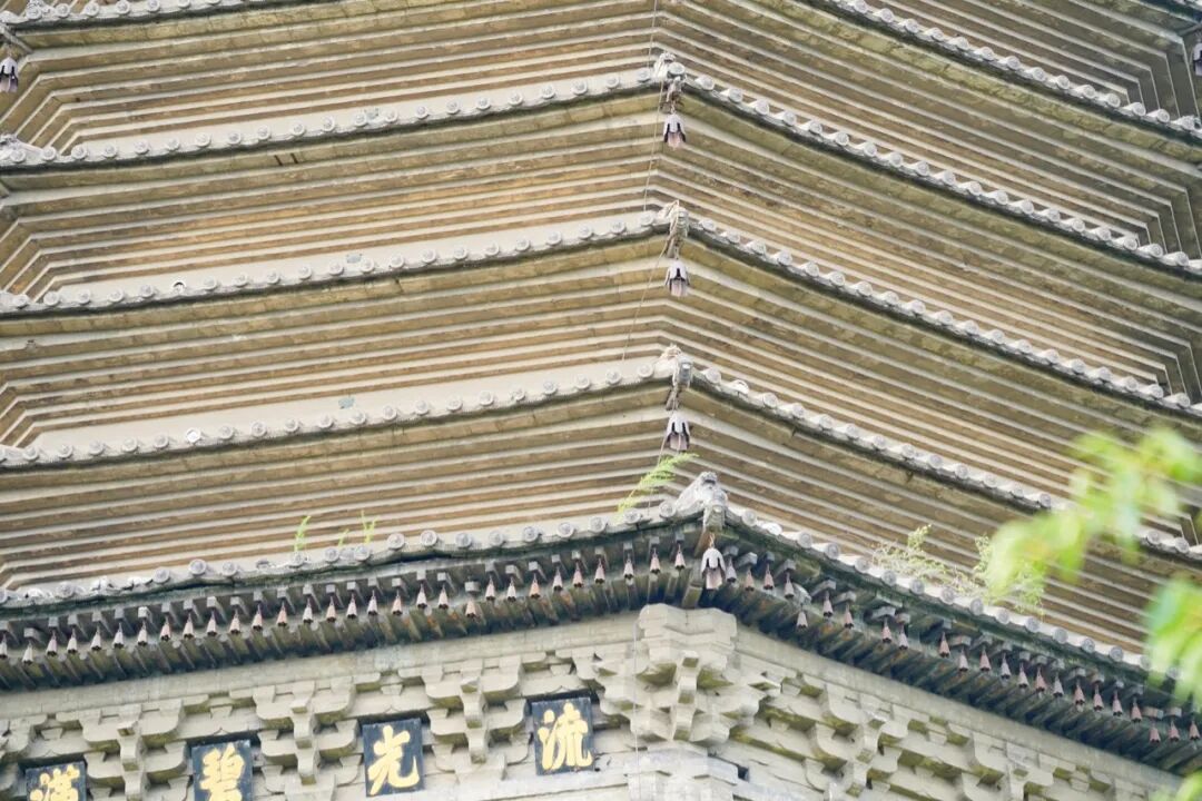初层塔身之上为12层的塔檐,每一层的高度比第一层要短很多,大约每层为1.5米左右,加上塔身处少了初层的浮雕装饰,看起来就要逊色很多。不过仿木结构的斗拱以及檐角悬挂的风铎,以及逐层递减呈秀气的锥形状,为塔身增色不少。