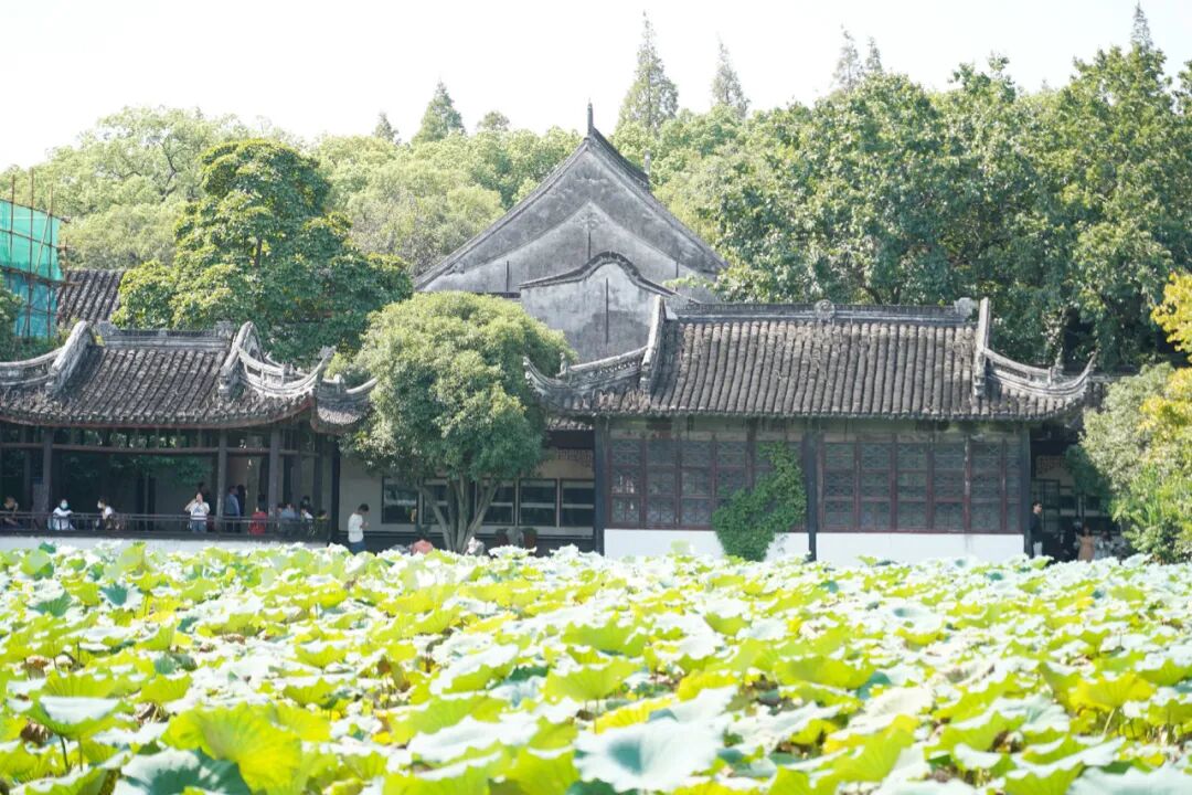 当我们跨过红色砖牌坊后,一眼就可以看到整座园林的精华,荷花池、假山、白墙黑瓦的建筑以及亭台楼阁搭配得相得益彰。