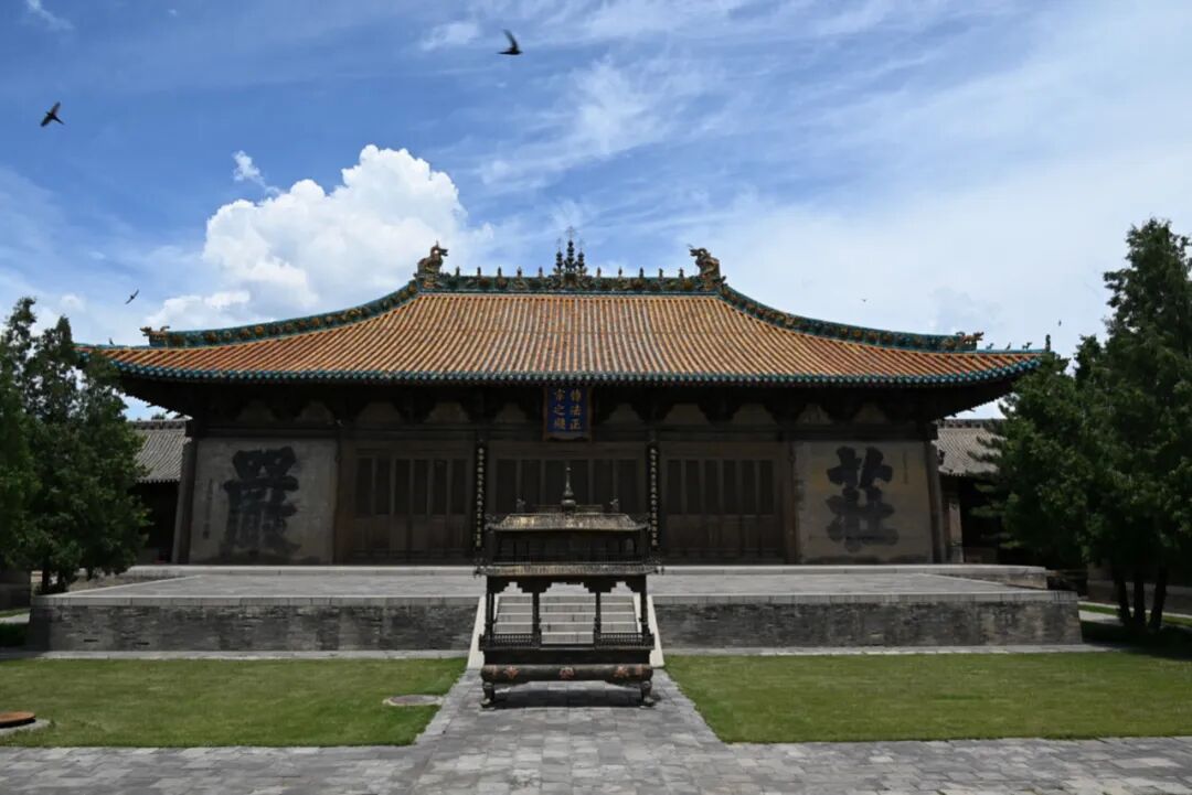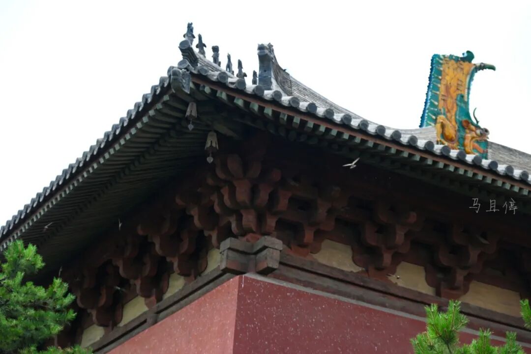大雄宝殿的正脊上琉璃鸱吻规模很大,高达4.5米成为中国古建筑上最大的琉璃吻兽。