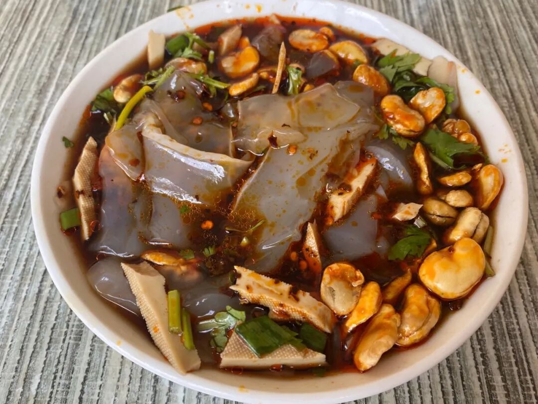 酸甜咸口味的浑源凉粉也很有大同特色,随意的选了一家,凉粉就很好吃,一大勺辣椒,一勺炸蚕豆,特别过瘾,关键还很便宜,6块钱一份。除此羊汤、凉糕、刀削面等都是必打卡的小吃。