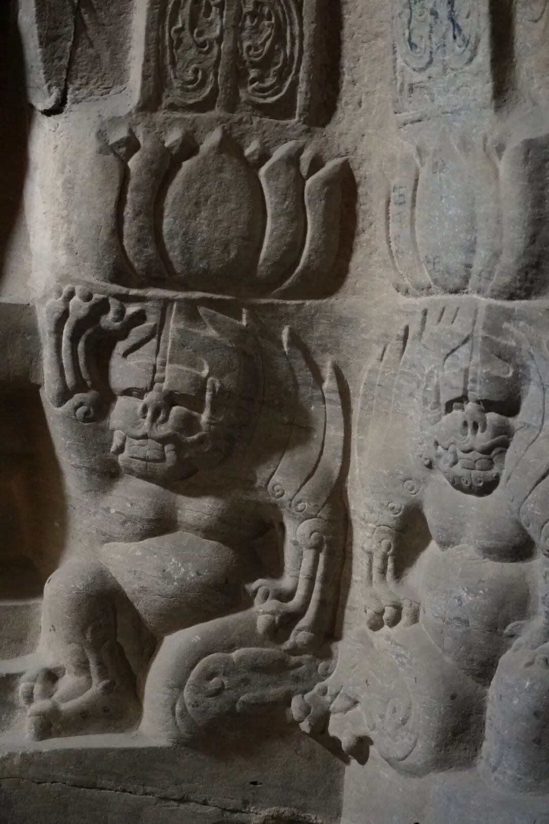 低头看看中心塔柱基座,可以看到几尊异域风情的神兽,这些造型像极了曾经在北齐墓壁画中看到的神兽几乎如出一辙。