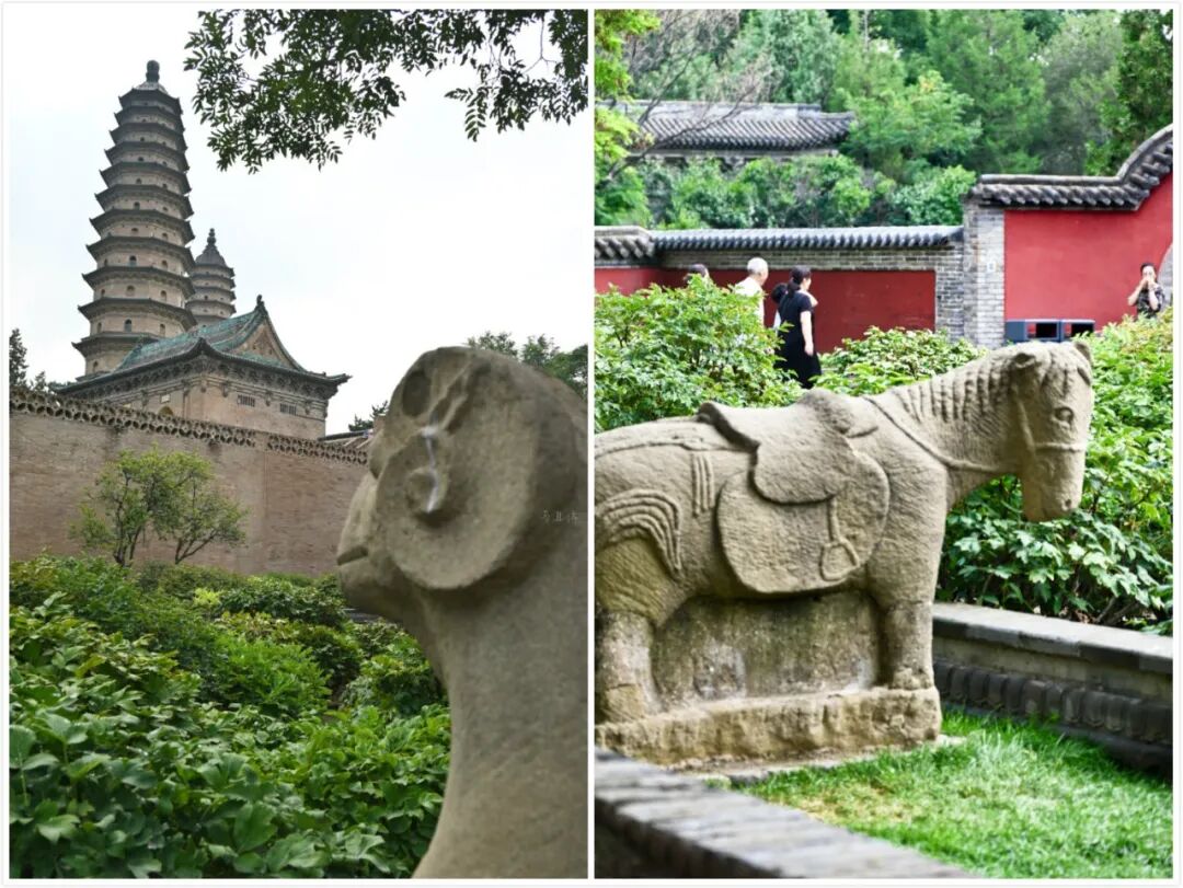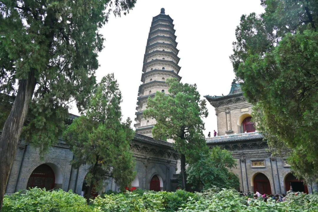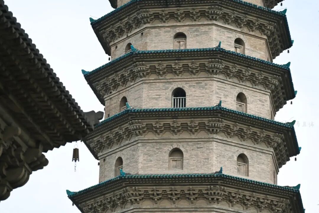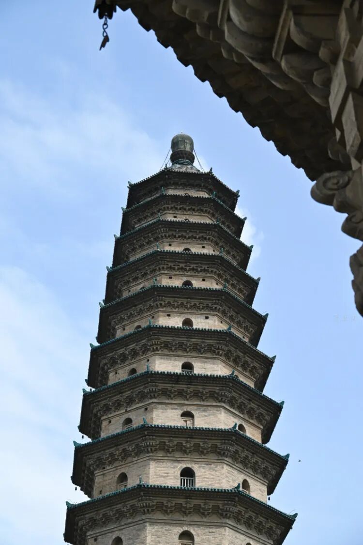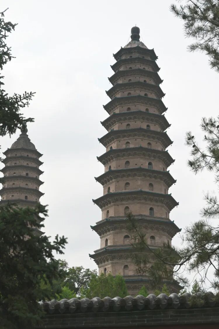 欣赏完大雄宝殿之后,就可以直奔塔院,也就是藏有太原地标性建筑双塔的区域。两座塔分别建造于1599年和1608年,高度相同均为54米,南北对峙,结构和大雄宝殿类似,也均为青砖砌的仿木构筑。