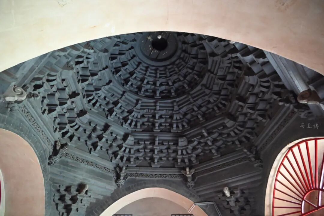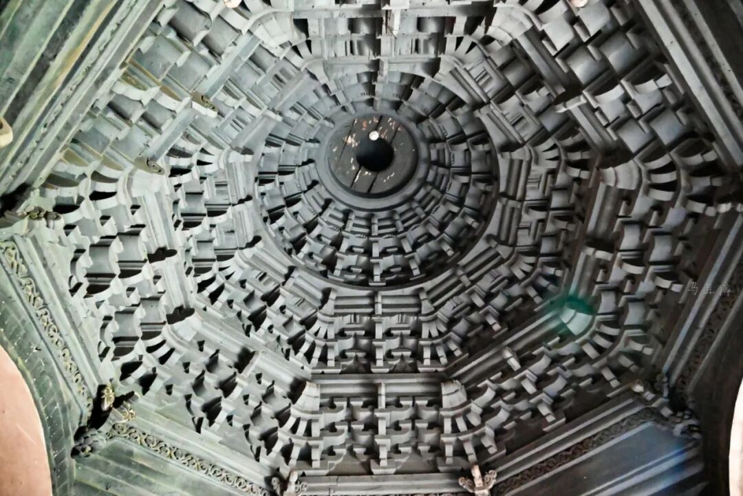 仔细发现的话,还可以看到大雄宝殿顶部有一座单檐歇山顶建筑的,重点可以关注殿堂内部的藻井,通过下大上小的砖砌成藻井,站在殿堂内部可以一览无遗。