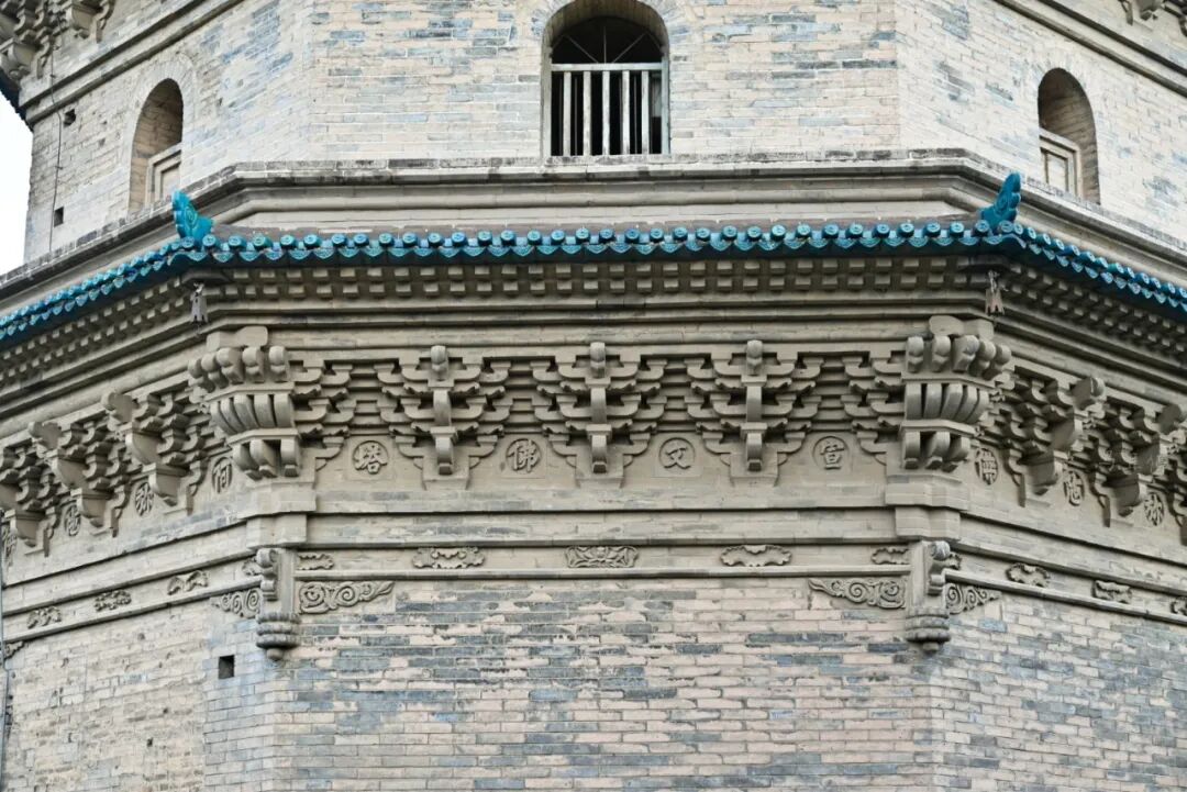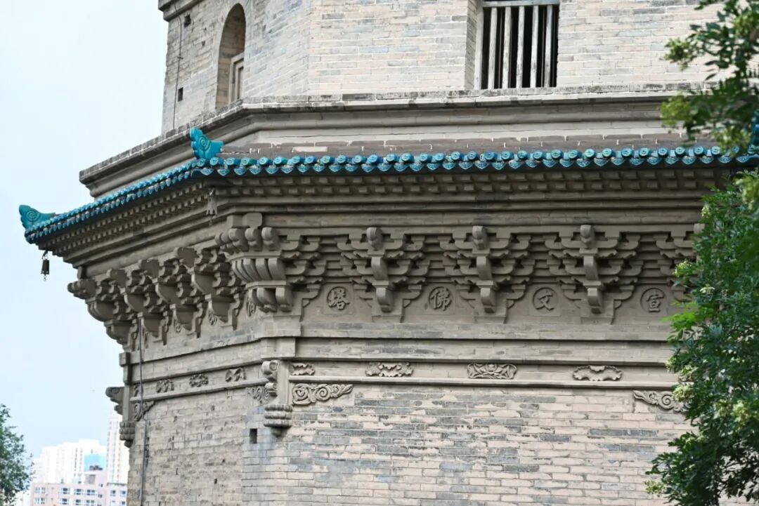 两座塔每层逐层收缩,呈锥形状,不论是远观还是近看都会发现双塔雄壮中多了几分秀气感。再来看看双塔的细节部分,其实还是有一些区别的,那就是旧塔相对来说收缩程度没有那么明显,且檐角用牡丹叶子装饰;新塔相对来说就要收缩明显了很多,且用莲花装饰檐角。