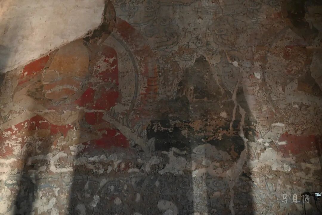 这些壁画虽然残破,但是细细观察的话还是可以发现一些特别之处,尤其是这些佛的面相有些喇嘛教佛像的特征,背光的线条很是流畅,同样是不可多得的壁画。抬头看的话,在梁架和内槽斗拱上还留有一些辽代的彩画。