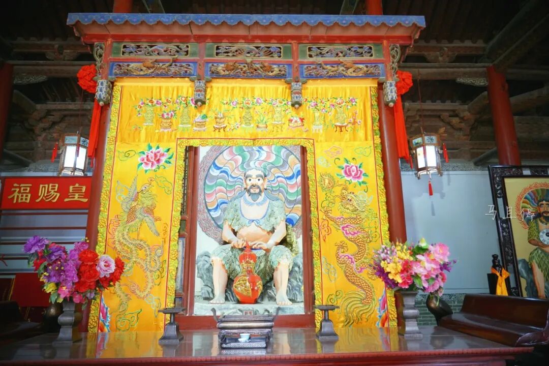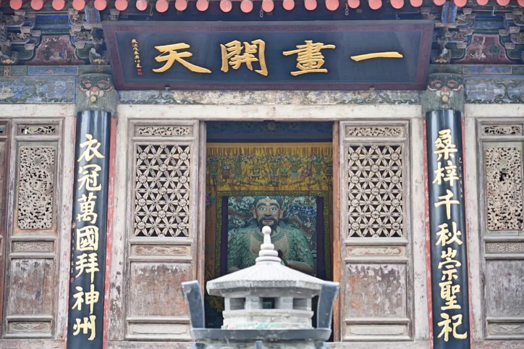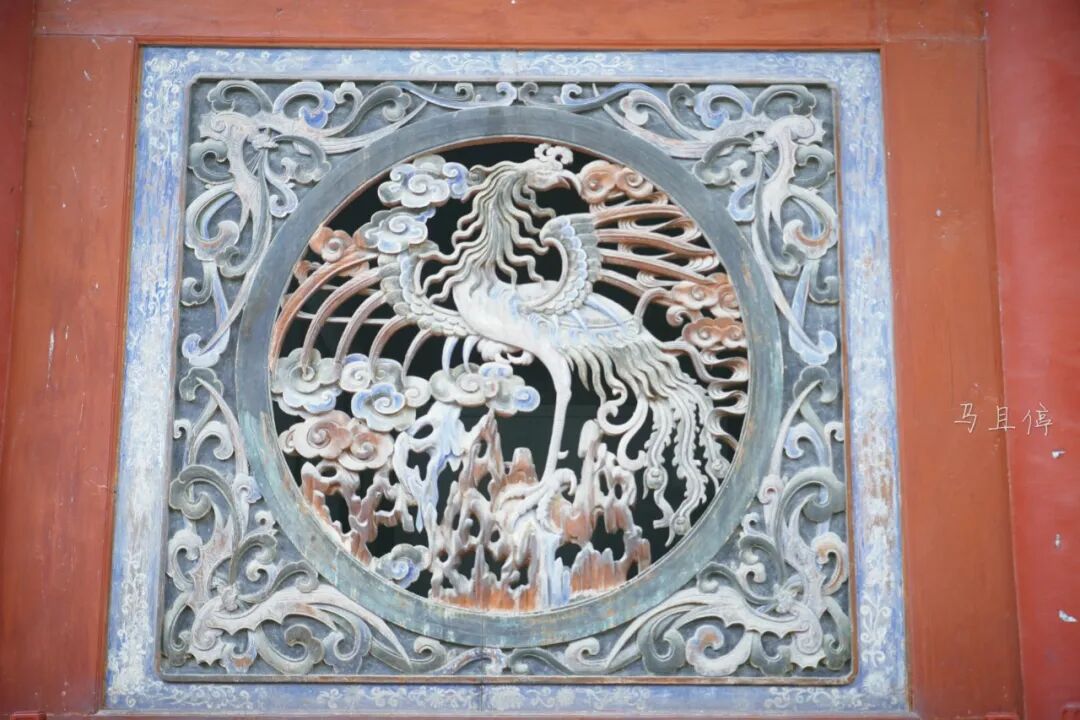 面阔7间重檐歇山的正殿内供奉着3米高的伏羲圣像,圣象头顶还描绘了伏羲六十四卦卦象图;正殿的顶部还可以看到明代精美的龙吻脊、雕花天宫宝刹琉璃装饰;正殿的前廊中雕刻有盘龙、团凤图案的隔扇门窗,也很是秀气。