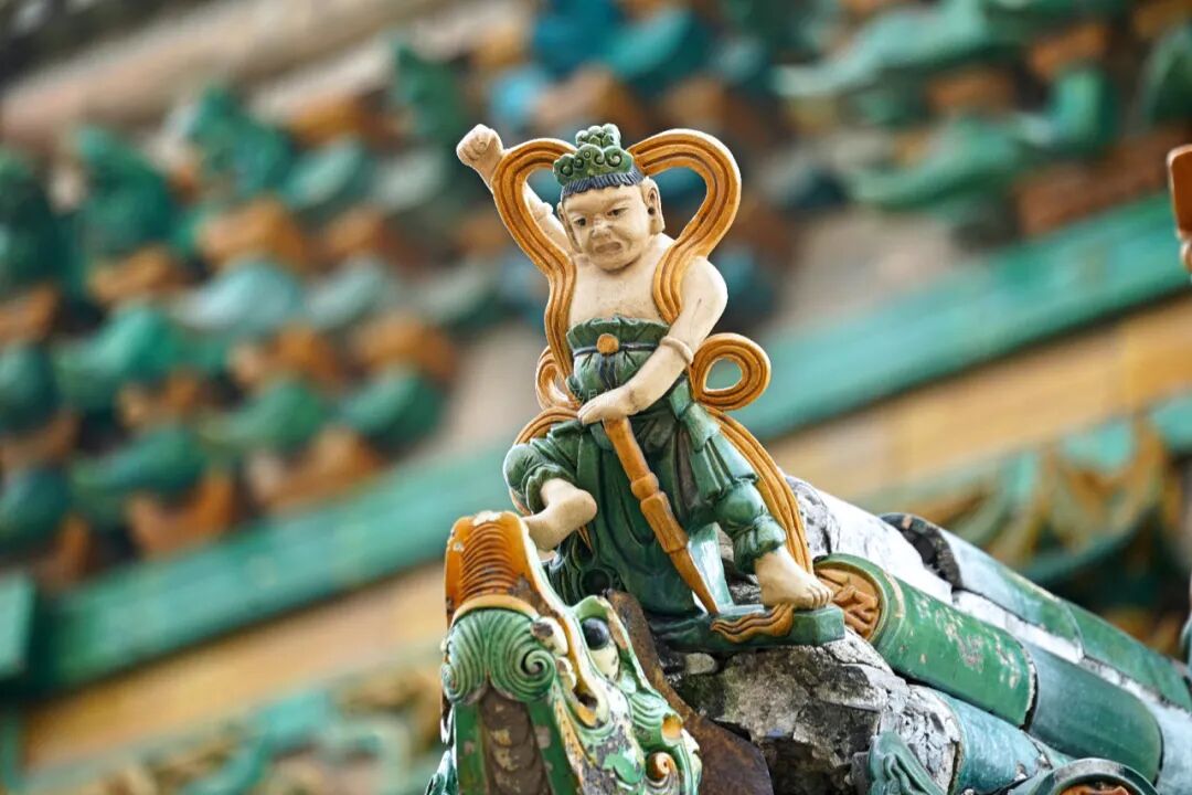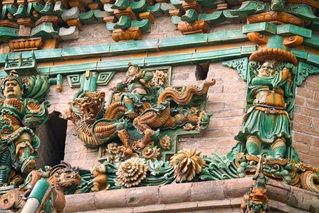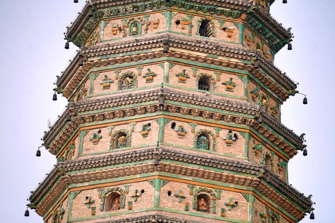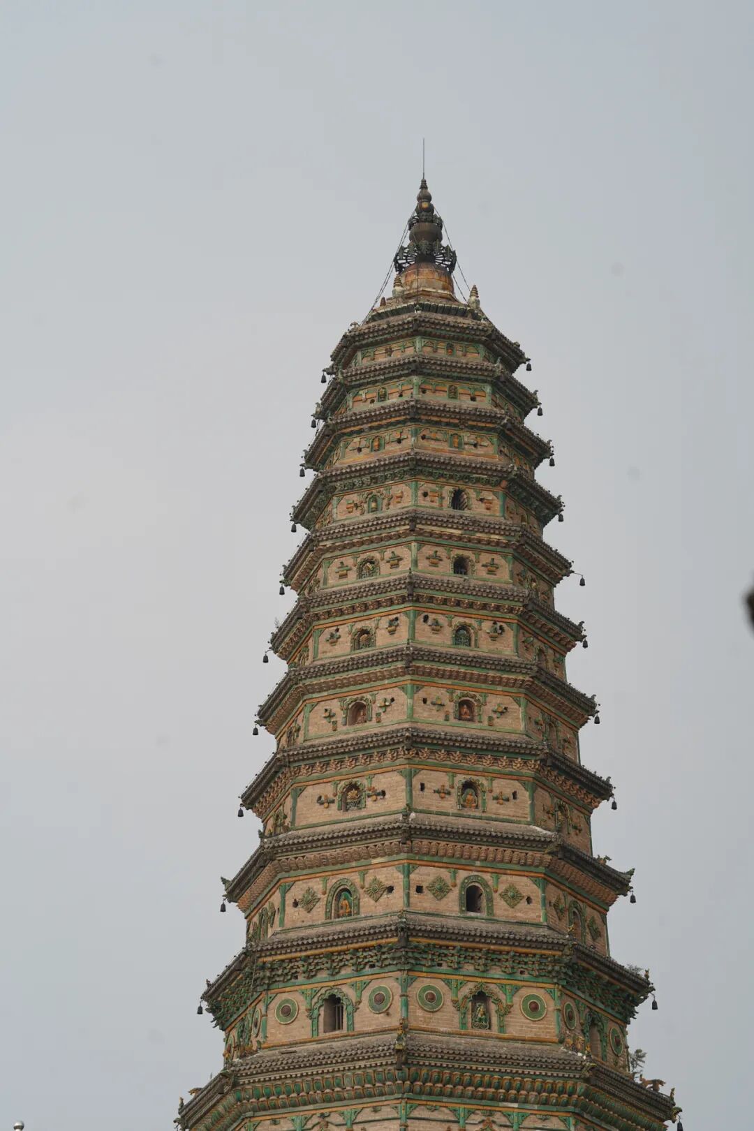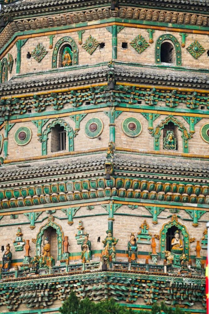 整个塔身1-3层的琉璃装饰品最为丰富和精美,尤其第二层每一面都分设三间,中间嵌有琉璃金刚力士,旁边两间嵌入盘龙、麒麟、明王驾龙等,转角镶嵌着呈负状的顶莲大力士。