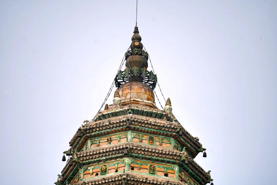 塔顶设有法轮,法轮中间镶嵌着重67.2市斤的风磨铜塔刹,每个檐角挂有风铃,站在塔下每当微风拂过之时,可以听到清脆的铃铛声。