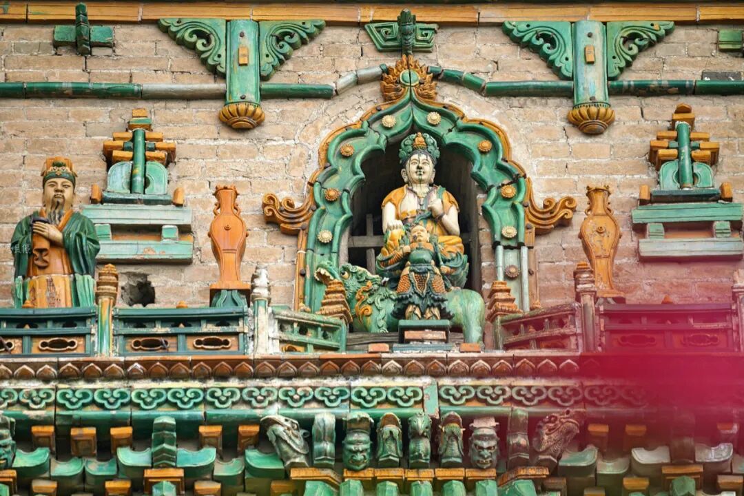 第三层同样非常精美,每层每一面的中间都嵌有琉璃菩萨,旁边的两间用琉璃胁侍菩萨装饰,转角之处设有琉璃金刚。