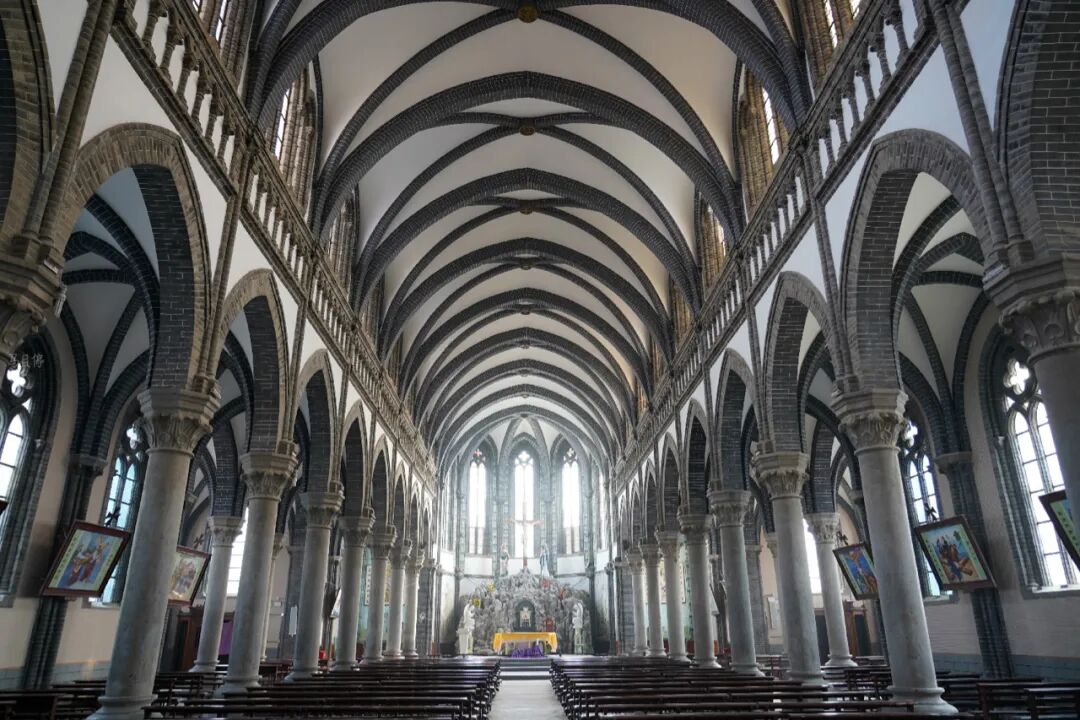 教堂外面是风格迥异的尖顶建筑,教堂内部是华丽的穹顶和花窗,阳光照耀之下呈现出色彩斑斓的画面,瞬间仿佛置身异域气息的国外。