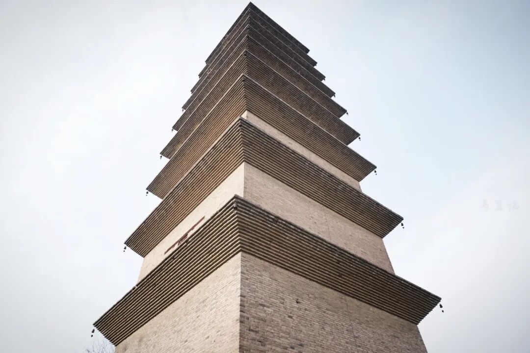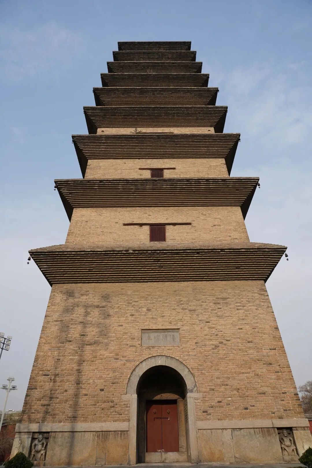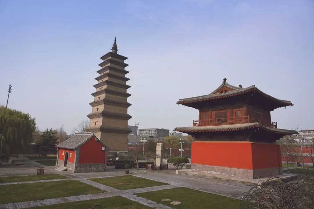首先看到的就是西侧的须弥塔,整个模样看起来有点像是缩小版的西安大雁塔,不过它的建造年代比大雁塔还要早上18年,因此可谓是历史悠久。如今的须弥塔呈正方形,建在高1.5米的台基之上,密檐九级,通高为39.5米。