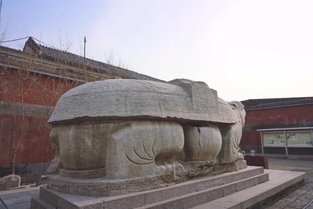 下台阶后,可以从最南端开始欣赏,东南方向可以看到一尊长8.4米,宽3.2米的巨大赑屃基座,重量更是达到了107吨,据说这是国内最大的一只赑屃,整个形状像乌龟,鼻孔有点像猪,所以看起来有些呆萌。
