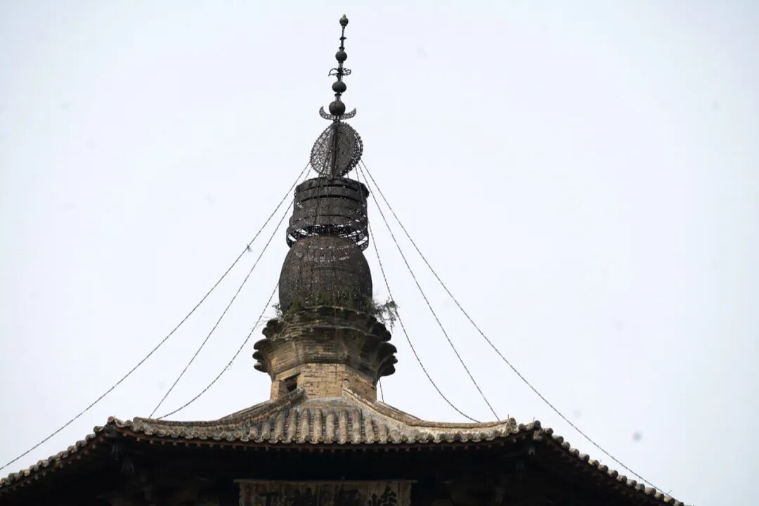 应县木塔的塔顶同样非常精美,为八角攒尖式,顶部设有铁刹,每一层的木檐下都装着风铃,微风拂过的时候还可以听到清脆的声音。