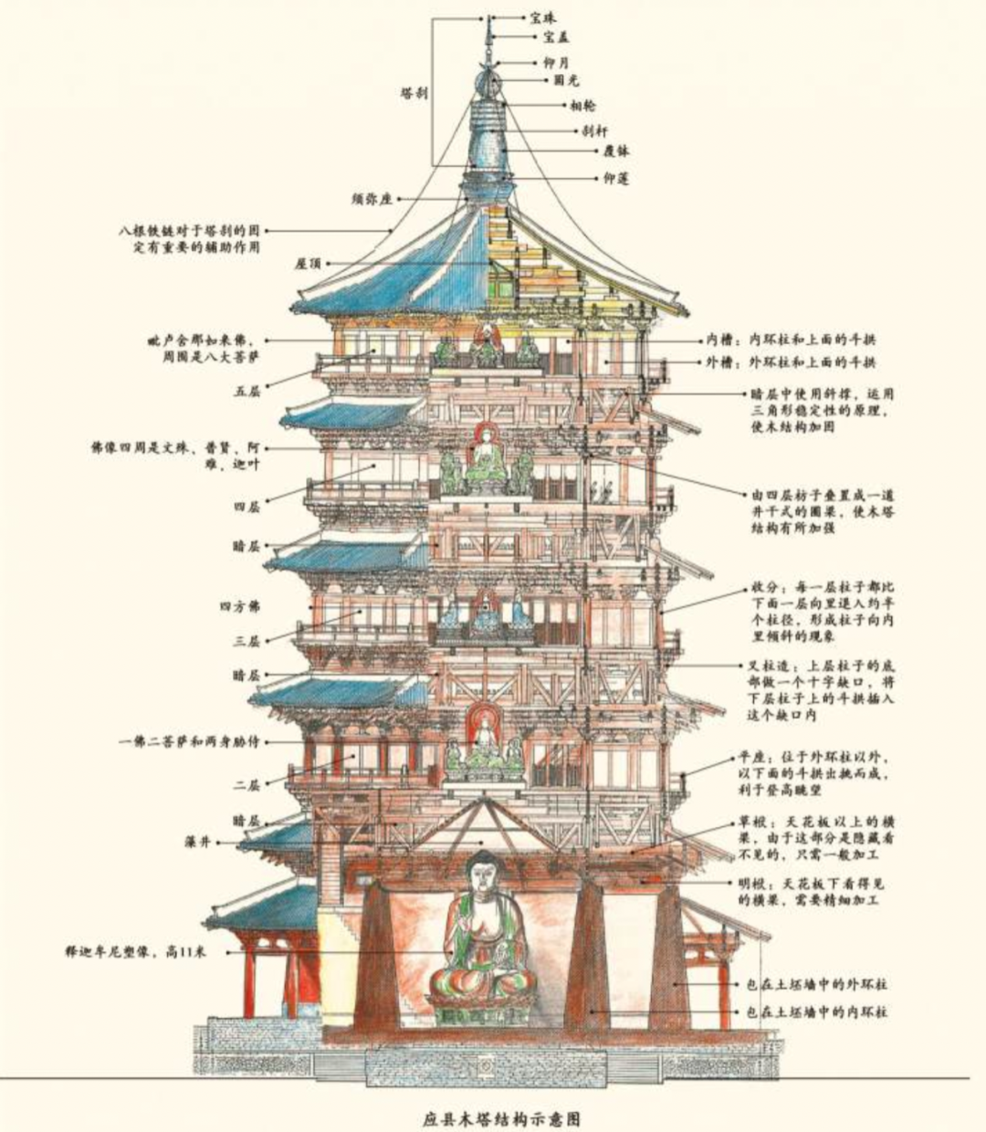 说到木塔坚固的话,那么我们不得不说一说应县木塔的建筑特色。如今我们看到的应县木塔为一座塔高67.31米的五层六檐木塔,因为各层内设有暗层因此木塔实际为9层。