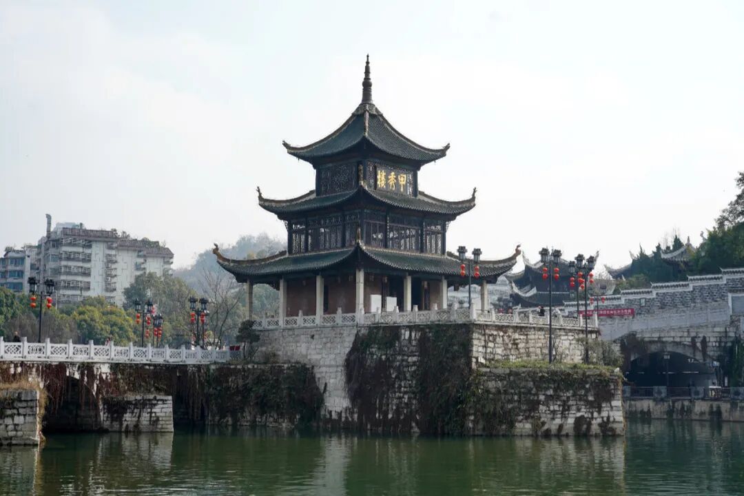 旅行完博物馆之后就可以前往南明河上的甲秀楼打卡,这座三层三檐四角攒尖顶的砖木结构的建筑,始建于明万历二十六年,如今保留下来的建筑为清宣统元年重建的遗存。